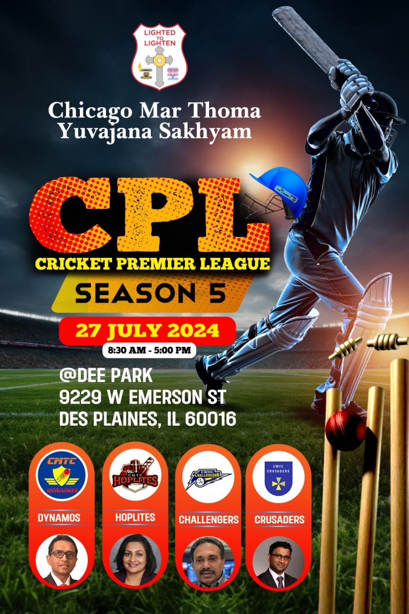 ചിക്കാഗൊ: ചിക്കാഗൊ മാർത്തോമ്മാ യുവജനസഖ്യത്തിന്റെ ആഭിമുഖ്യത്തിൽ 5-മത് മാർത്തോമ്മാ ക്രിക്കറ്റ് പ്രീമിയർ ലീഗ് ജൂലൈ 27 ശനിയാഴ്ച്ച രാവിലെ 8 മണിമുതൽ ഡെസ്പലയിൻസ് ഡീ പാർക്ക് ക്രിക്കറ്റ് സ്റ്റേഡിയത്തിൽ വെച്ചു നടത്തപ്പെടുന്നു. ചിക്കാഗോ മാർത്തോമ്മാ യുവജനസഖ്യം പ്രസിഡന്റ് റവ. എബി. എം തോമസ് തരകൻ പ്രീമിയർ ലീഗ് ഉൽഘാടനം ചെയ്യും, റവ. ബിജു വൈ മുഖ്യ അതിഥി ആയിരിക്കും. ഡോണാ അലക്സ് മെമ്മോറിയൽ എവറോളിങ് ട്രോഫിക്ക് വേണ്ടിയുളള ഈ ക്രിക്കറ്റ് പ്രീമിയർ ലീഗിൽ ചിക്കാഗോ മാർത്തോമ്മാ ഇടവകയിലെ യുവജനങ്ങൾ പങ്കാളികളായി നേതൃത്വം നൽകും. മുൻ വർഷങ്ങളിലെപ്പോലെ IPL മാതൃകയിൽ ആണ് ഈ വർഷത്തെ ടീമുകളുടെ തിരഞ്ഞെടുപ്പ് പ്രക്രിയ ക്രമീകരിച്ചിരിക്കുന്നത്. ചിക്കാഗോ മാർത്തോമ്മാ ഇടവകയിൽ നിന്നും റജിസ്റ്റർ ചെയ്ത 50-ൽ അധികം ക്രിക്കറ്റ് പ്രേമികൾ ഈ വർഷത്തെ പ്രീമിയർ ലീഗിൽ വിവിധ ടീമുകളിലായി അണിനിരക്കും. ഇതിനോടകം ടീമുകളുടെയും, ടീമംഗങ്ങളുടേയും ലേലം പൂർത്തിയായതായി സംഘാടകസമിതി അറിയിച്ചു. ഷിജി അലക്സിന്റെ ഉടമസ്ഥതയിലുള്ള "CMTC HOPLITES", ജോർജ് മൊളക്കലിന്റെ "CMTC DYNAMOS", ജോസ് വർഗീസിന്റെ "CMTC CHALLENGERS", ജൊ എം ജോർജിന്റെ "CMTC CRUSADERS" എന്നീ ടീമുകൾ ഈ വർഷത്തെ ക്രിക്കറ്റ് പ്രീമിയർ ലീഗിൽ പങ്കെടുക്കും. ചിക്കാഗോയിലെ വിവിധ ക്രിക്കറ്റ് ടീമുകളിൽ അംഗങ്ങൾ ആയിട്ടുളള പ്രഗത്ഭരായ കളിക്കാരാണ് ഈ വർഷത്തെ മാർത്തോമ്മാ ക്രിക്കറ്റ് പ്രീമിയർ ലീഗിൽ വിവിധ ടീമുകൾക്കുവേണ്ടി കളിക്കളത്തിൽ അണിനിരക്കുന്നത്. ലിനു ഏം ജോസഫിന്റെ നേതൃത്വത്തിൽ അജു മാത്യു, ജോമി റോഷൻ വർഗീസ് എന്നിവർ കൺവീനേഴ്സായി വിപുലമായ കമ്മറ്റി പ്രീമിയർ ലീഗിന്റെ ക്രമീകരണങ്ങൾക്ക് നേതൃത്വം നൽകുന്നു. ഈ വർഷത്തെ ക്രിക്കറ്റ് പ്രീമിയർ ലീഗിലെ ടീമുകളുടെ ജേഴ്സി അനാച്ഛാദനം ജൂലൈ 14-ന് നടക്കും. 5-മത് മാർത്തോമ്മാ ക്രിക്കറ്റ് പ്രീമിയർ ലീഗിലേക്കു ഏവരേയും സ്വാഗതം ചെയ്യുന്നതായി സംഘാടകർ അറിയിച്ചു.