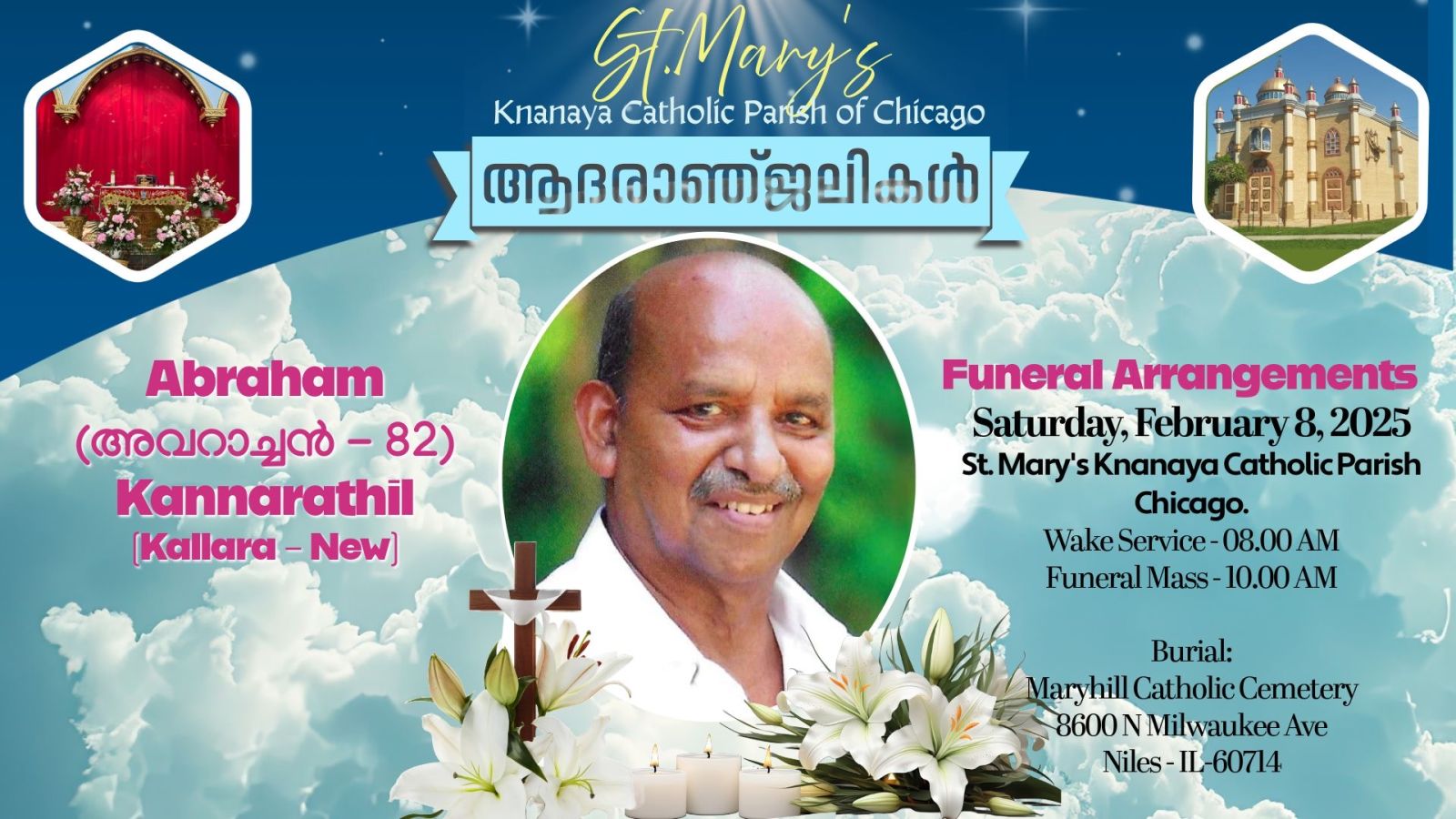ചിക്കാഗോ: ചിക്കാഗോയിൽ അന്തരിച്ച കല്ലറ സ്വദേശി എബ്രഹാം കണ്ണാരത്തിലിന്റെ ( 82 ) സംസ്കാരം ഫെബ്രുവരി 8 ന് ശനിയാഴ്ച മോർട്ടൻ ഗ്രോവ് സെൻ്റ് മേരീസ് ക്നാനായ കത്തോലിക്കാ പള്ളിയിൽ വെച്ചു നടത്തപ്പെടും . രാവിലെ 8 മണി മണി മുതൽ 10 മണി വരെ പൊതുദർശനം. തുടർന്ന് ദിവ്യബലിയും പ്രാർത്ഥനാ ശുശ്രൂഷകളും.നൈൽസിലുള്ള മേരിഹിൽ കാത്തലിക് സെമിത്തേരിയിൽ സംസ്ക്കാരം നടക്കും.