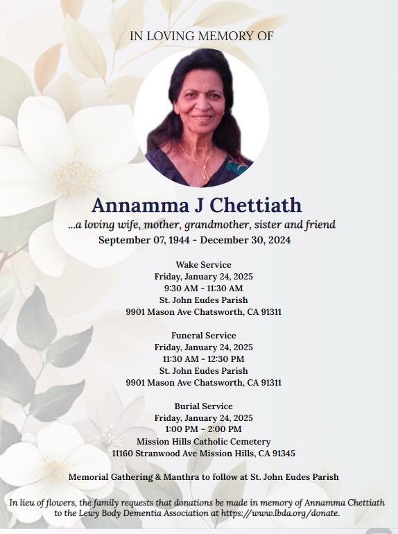 ജനുവരി 24-ന് വെള്ളിയാഴ്ച രാവിലെ 9.30 മുതല് പൊതുദര്ശനവും തുടര്ന്ന് സംസ്കാര ശുശ്രൂഷകളും സെന്റ് ജോണ് യൂഡ്സ് കാത്തലിക് പള്ളിയില് (9901 Mission Ave, Chatsworth, CA) വെച്ച് നടത്തപ്പെടും. ഒരു മണിക്ക് മിഷന് ഹില്സ് കാത്തലിക് സെമിത്തേരിയില് (11160 Stranwood Ave, Mission Hills, CA) സംസ്കാരം നടക്കും.