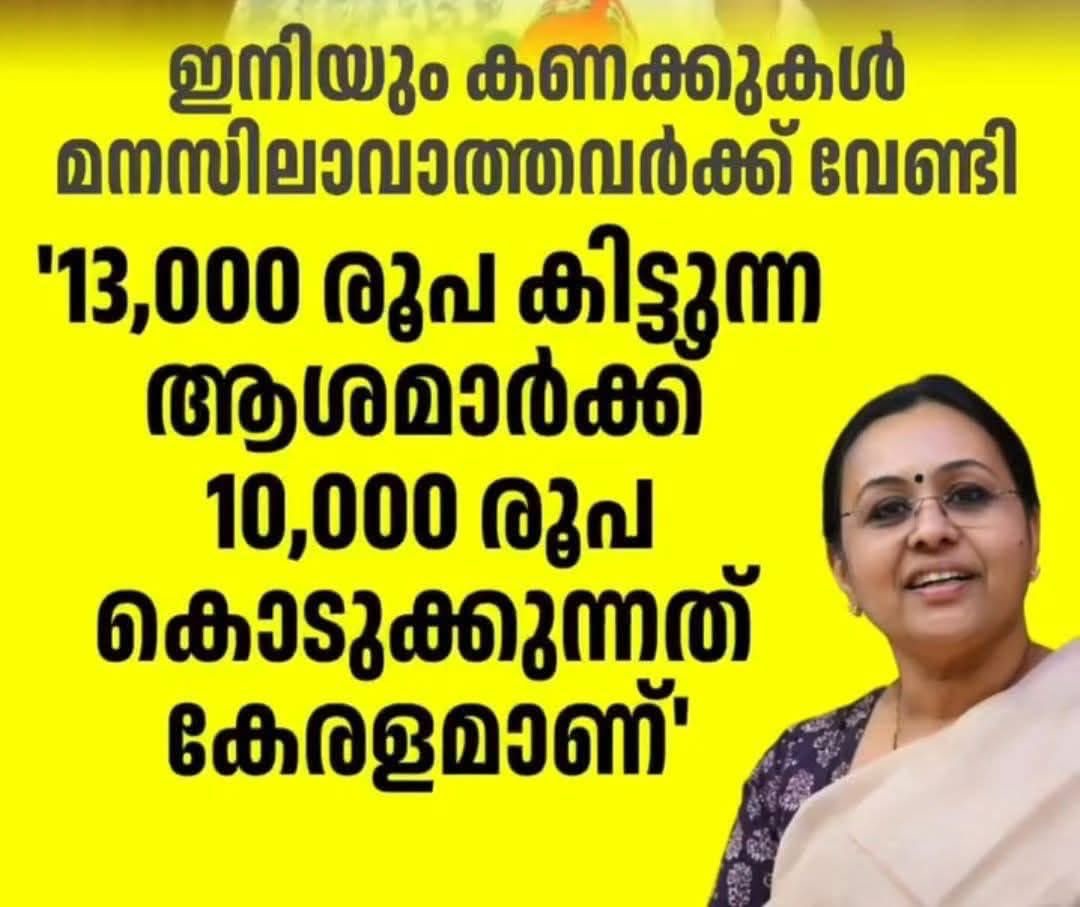 കേന്ദ്രവും സംസ്ഥാനവും ബിജെപി ഭരിക്കുന്ന ഡൽഹിയിൽ ആശ വർക്ക് നൽകുന്നത് വെറും 3000 രൂപ മാത്രം. അത് വർദ്ധിപ്പിക്കാൻ അവിടെ SUCI ക്ക് സമരമില്ല കോൺഗ്രസിനും ബിജെപിക്കും സമരമില്ല. 7000 രൂപ ഉൾപ്പെടെ 13200 കൊടുക്കുന്ന ഈ കൊച്ചു കേരള സർക്കാരിനെതിരെയാണ് ഇവരുടെ സമരം. ഇതിനെ രാഷ്ട്രീയ സമര മെന്നല്ലാതെ മറ്റെന്ത് പേരിട്ടു വിളിക്കണം.