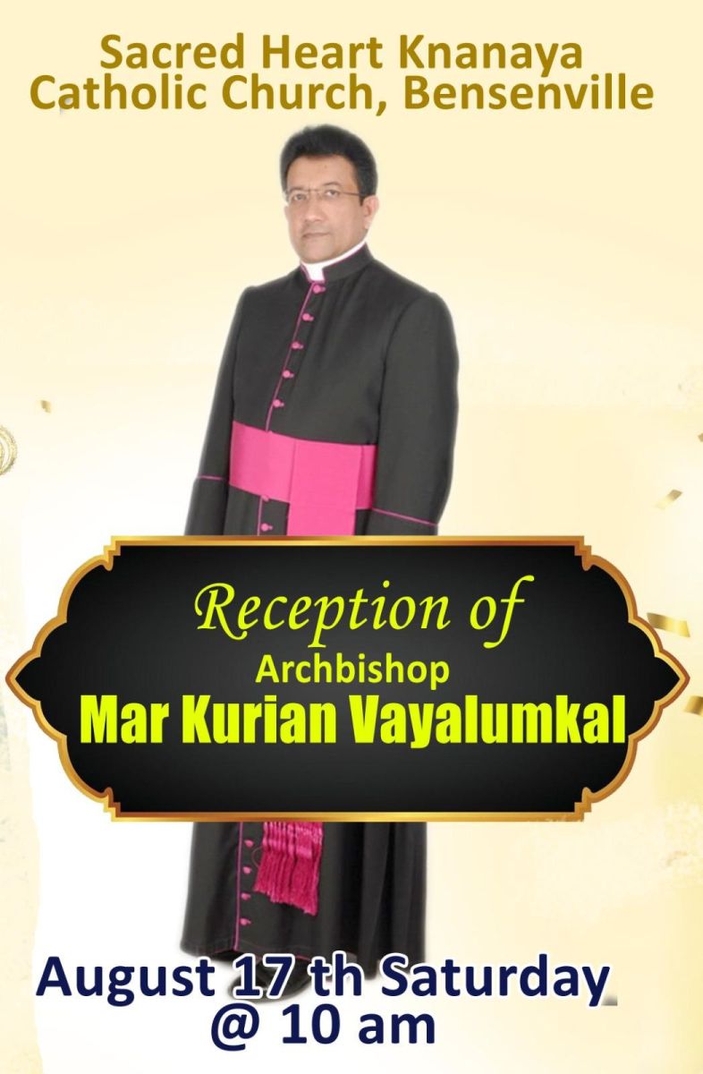 ഷിക്കാഗോ: അൾജീരിയയുടെയും ട്യുണീഷ്യയുടെയും വത്തിക്കാൻ സ്ഥാനപതിയായി സ്ഥാനം ഏറ്റെടുത്തതിന് ശേഷം ആദ്യമായി അമേരിക്കയിൽ എത്തുന്ന കോട്ടയം അതിരൂപതാംഗമായ ആർച്ച് ബിഷപ്പ് മാർ. കുര്യൻ വയലുങ്കൽ പിതാവിന് ബെൻസൻവിൽ ഇടവക ഊഷ്മള സ്വീകരണം ഒരുക്കുന്നു. ആഗസ്റ്റ് 17 ശനിയാഴ്ച 9.45 am ന് ഇടവകയുടെ നേതൃത്വത്തിൽ സ്വീകരണം നൽകും. തുടർന്ന് അഭി.പിതാവ് വി. കുർബാനയ്ക്ക് മുഖ്യ കാർമികത്വം വഹിയ്ക്കും. വി.കുർബാനയ്ക്ക് ശേഷം ക്നാനായ റീജിയൻറെ വിശ്വാസ പരിശീലന വർഷ ഉദ്ഘാടനം ആർച്ച്ബിഷപ്പ് നിർവ്വഹിക്കും. പുതിയതായി രൂപപ്പെടുത്തിയ വിശ്വാസ പരിശീലന ലോഗോയും പ്രകാശനം ചെയ്യും. ബെൻസൻവിൽ ഇടവക കൈക്കാരൻമാരായ തോമസ്സ് നെടുവാമ്പുഴ, മത്തിയാസ് പുല്ലാപ്പളളിൽ, സാബു മുത്തോലം, കിഷോർ കണ്ണാല, ജെൻസൻ ഐക്കരപറമ്പിൽ എന്നിവർ ക്രമീകരണങ്ങൾക്ക് നേതൃത്വം നൽകും.