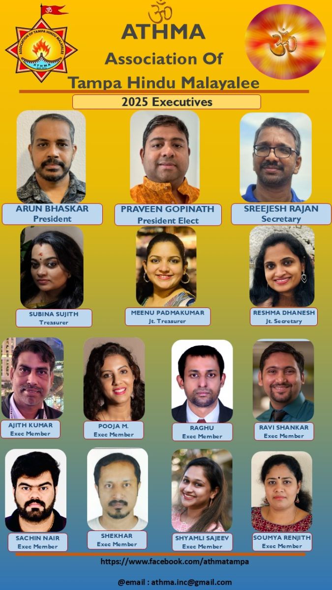 റ്റാമ്പാ : പന്ത്രണ്ടാം വർഷത്തിലേക്കു കടക്കുന്ന റ്റാമ്പായിലെ മലയാളി ഹിന്ദു കൂട്ടായ്മയായ ആത്മയുടെ 2025 കമ്മിറ്റി നിലവിൽ വന്നു. ചാരിറ്റി പ്രവർത്തനങ്ങളിലും യുവജനങ്ങൾക്കായുള്ള പ്രവർത്തനങ്ങളിലും വളരെയധികം മാതൃകാപരമായ പ്രവർത്തനങ്ങളാണ് രണ്ടായിരത്തി പതിമൂന്നു മുതൽ ആത്മ നടത്തിക്കൊണ്ടു വരുന്നത്. ഏകദേശം ഇരുന്നൂറ്റി അൻപതിലധികം സജീവഅംഗങ്ങളുള്ള ആത്മ റ്റാമ്പായിലെ എല്ലാ സാംസ്കാരിക പ്രവർത്തനങ്ങളിലും മുന്പന്തിയിലുണ്ട്.