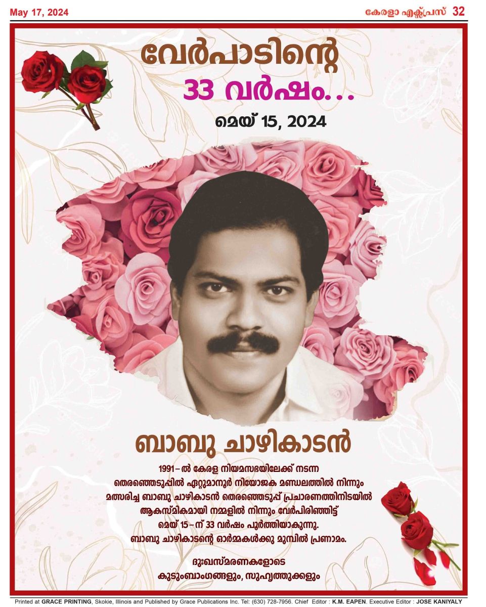 നീലാകാശത്തിന്റെ അകലങ്ങളിലെന്നെങ്കിലും ഒരു നക്ഷത്രം മിന്നിമറയുമ്പോൾ പ്രിയപ്പെട്ട ബാബു, നിന്നെപ്പറ്റി വെറുതെയോർക്കും ഞങ്ങൾ. അകലങ്ങളിലെവിടെയോ ഇരുന്ന് നീ ഞങ്ങളെ കാണുന്നുണ്ടാവുമെന്നോർക്കും.വല്ലപ്പോഴും കളഞ്ഞു കിട്ടുന്ന നനുത്ത സായാഹ്നങ്ങളിൽ വിളിക്കാത്ത അതിഥിയെപ്പോലെ എത്തിനോക്കുന്ന ഓർമകളിൽ ഒരു തേങ്ങലായി ഇന്നും വിരുന്നു വരുന്നു നിന്റെ ചിരിക്കുന്ന മുഖം.ഞങ്ങൾ നിനച്ചിരിക്കാത്ത നിമിഷങ്ങളിൽ ദൈവദൂതന്മാരുടെ അകമ്പടിയോടെ ജഗദീശ്വരന്റെ കരങ്ങളിലേക്ക് നീ സംവഹിക്കപ്പെട്ട നിമിഷങ്ങളിൽ ഇടിവാൾ മിന്നി.ഇന്നലെ പെയ്ത മഴയിറങ്ങുമ്പോഴേക്കും, അതിനകമ്പടിയായി ഇടിവാൾ മിന്നുമ്പോഴും ഞങ്ങളുടെ ഓർമ്മകളിലും നീ ഒരു നൊമ്പരമായി മിന്നിമായുന്നുണ്ടല്ലോ.