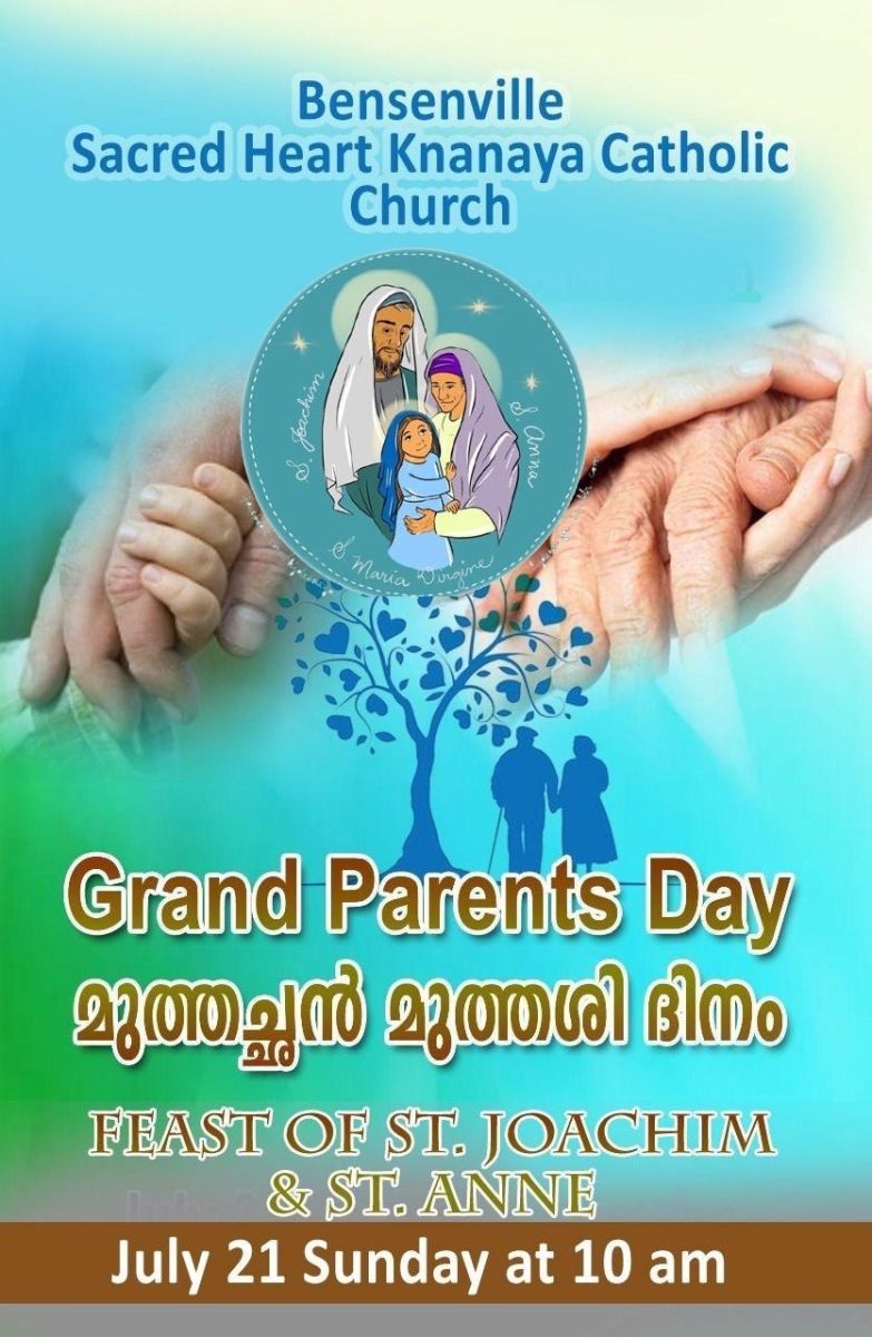 ചിക്കാഗോ: ബെൻസൻവില്ല് തീരുഹൃദയ ക്നാനായ കത്തോലിക്ക ഇടവകയിലെ ഗ്രാന്റ് പേരന്റ്സ് ഡേ വിവിധ പരുപാടികളോടെ ജൂലൈ 21 ഞായറാഴ്ച നടത്തപ്പെടും. പരി. അമ്മയുടെ മാതാപിതാക്കളും യേശുവിന്റെ ഗ്രാന്റ് പേരന്റ്സ് ആയ വിശുദ്ധ യോവാക്കിം അന്ന ദമ്പതികളുടെ തീരുനാൾ ദിവസമാണ് കത്തോലിക്ക സഭയിൽ ഗ്രാന്റ് പേരന്റ്സ് ദിനമായി ആഘോഷിക്കുന്നത്. അന്നേ ദിവസം രാവിലെ 9 ന് ആരാധനയും തുടർന്ന് വി. കുർബ്ബാനയും ആദരിക്കലും കലാപരുപാടികളും നടത്തപ്പെടും.
