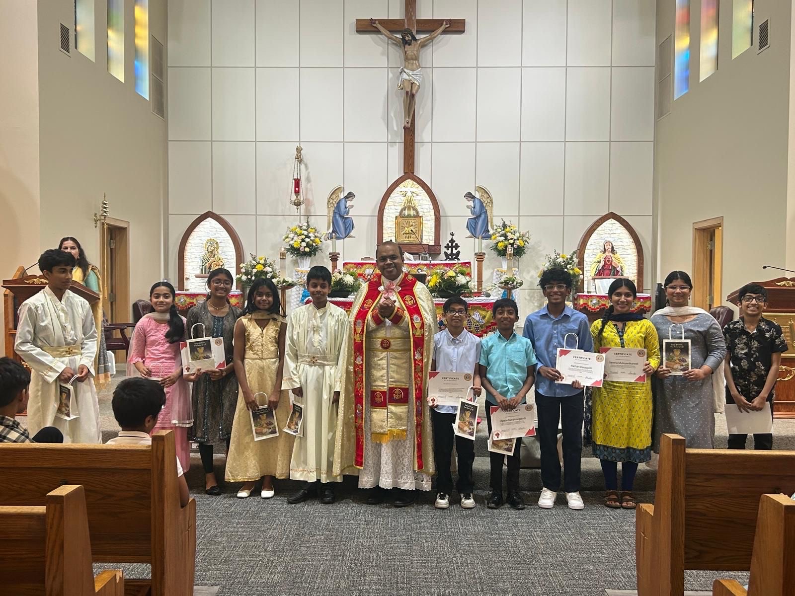ബെൻസൻവിൽ: ചിക്കാഗോ രൂപത വിശ്വാസ പരിശീലന വിഭാഗത്തിന്റെ ഭാഗമായി കുട്ടികൾക്കായി നടപ്പാക്കിയ ബൈബിൾ റീഡിങ് ചലഞ്ചിൽ പങ്കെടുത്ത് പൂർത്തിയാക്കിയ ഇഷാന പുതുശ്ശേരിൽ, നീവ ചകിരിയാംതടത്തിൽ, മിലൻ പുത്തൻപുരയിൽ, മിലിറ്റ് പുത്തൻപുരയിൽ, മരീസ വെട്ടിക്കാട്ട്, ലീവിയ വെട്ടിക്കാട്ട്, ക്ളെയോൺ നാരമംഗലത്ത്, ക്ളെമന്റ് നാരമംഗലത്ത്, റെബേക്ക മുളയാനിക്കുന്നേൽ, ജോസഫ് മുളയാനിക്കുന്നേൽ, സെറീന മുളയാനിക്കുന്നേൽ, നേഥൻ കാരാപ്പള്ളിൽ, ജെയ്സ് കരുനാട്ട് എന്നിവർക്ക് പ്രത്യേകം സർട്ടിഫിക്കറ്റുകൾ അസി.വികാരി ഫാ. ബിൻസ് ചേത്തലിൽ വിതരണം ചെയ്തു. കുട്ടികളെ ഇതിനായി പ്രോത്സാഹിപ്പിച്ച മാതാപിതാക്കളെ പ്രത്യേകം അഭിനന്ദിച്ചു.