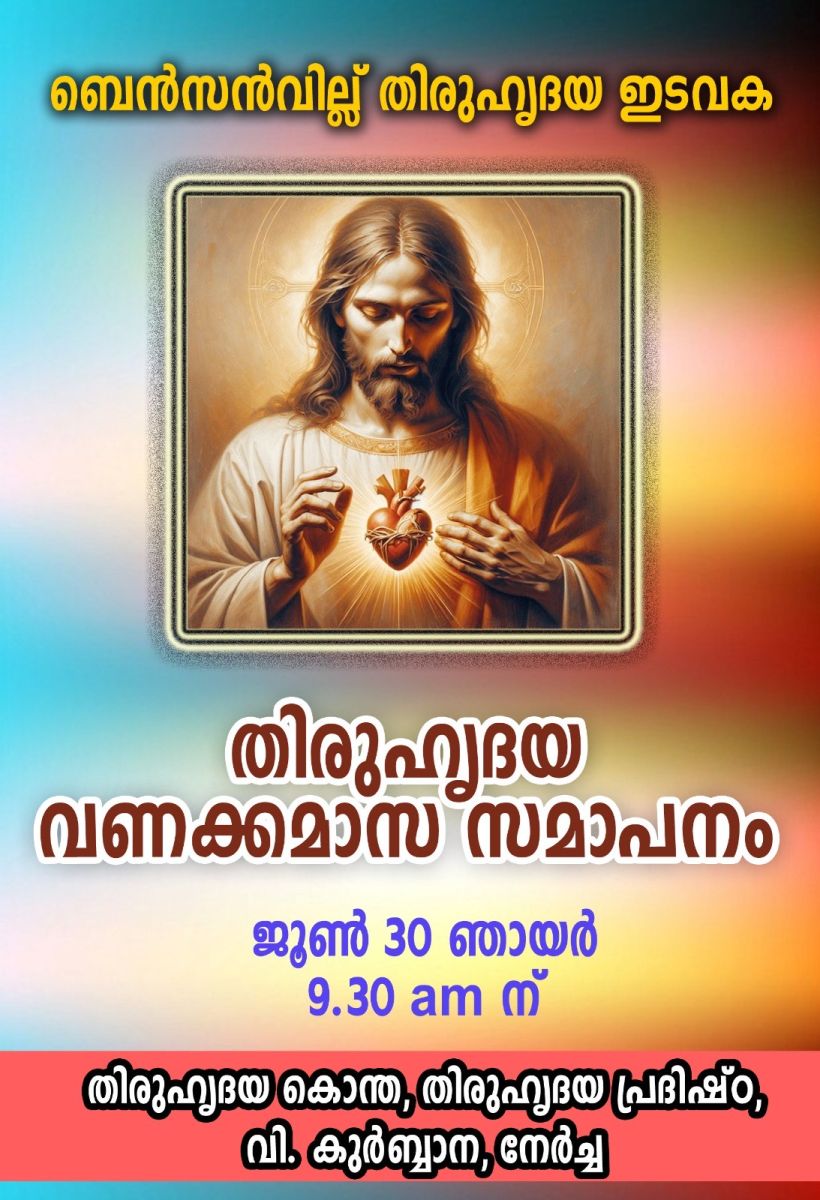 ചിക്കാഗോ: ബെൻസൻവിൽ തിരുഹൃദയ ക്നാനായ കത്തോലിക്കാ ഫൊറോനാ ദൈവാലയത്തിൽ ആഘോഷമായ തിരുഹൃദയ വണക്കമാസ സമാപനം നടത്തപ്പെടുന്നു. ജൂൺ 30 ഞായർ രാവിലെ 9.30 ന് തീരുഹൃദയ ഗ്രോട്ടോയിൽ തിരുഹൃദയ കൊന്തയും തുടർന്ന് പ്രദക്ഷിണമായി ദൈവാലയത്തിൽ എത്തി തീരുഹൃദയ പ്രതിഷ്ഠയും നടത്തപ്പെടും. തുടർന്ന് വി. കുർബ്ബാനയും നേർച്ച വിതരണവും നടക്കും. ഈശോയുടെ തിരുഹൃദയത്തിന് പ്രത്യേകമായി പ്രതിഷ്ഠിക്കപ്പെട്ട ഇടവക എന്ന നിലയിൽ ഇടവകജനങ്ങൾഒന്നാകെ ഒരു മാസമായി പ്രാർത്ഥിച്ച് ഒരുങ്ങി ഈ ജൂൺ മാസം പ്രത്യേകം കൊണ്ടാടി. വികാരി ഫാ. തോമസ് മുളവനാൽ, അസി. വികാരി ഫാ. ബിൻസ് ചേത്തലിൽ, ട്രസ്റ്റിമാരായ തോമസ് നെടുവാമ്പുഴ, സാബു മുത്തോലം, മത്തിയാസ് പുല്ലാപ്പള്ളി, കിഷോർ കണ്ണാല, ജെൻസൺ ഐക്കരപ്പറമ്പിൽ എന്നിവർ എന്നിവർ ക്രമീകരണങ്ങൾക്ക് നേതൃത്വം നൽകും.