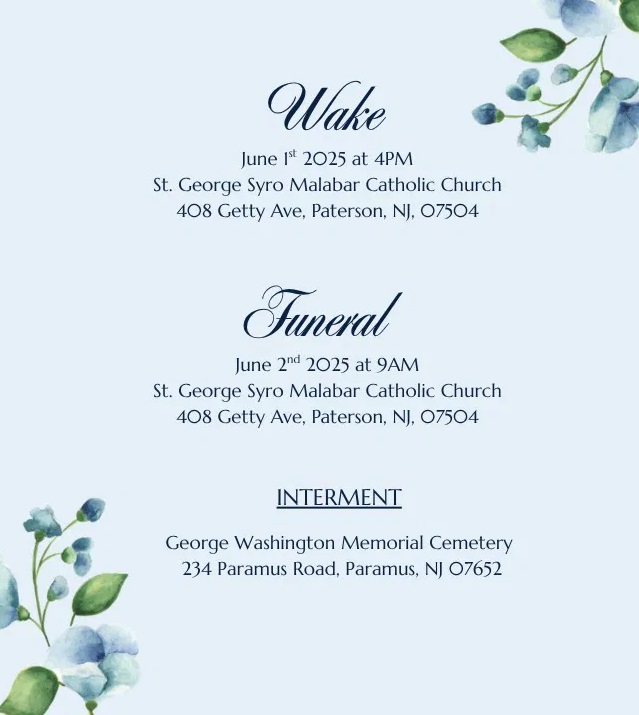 പൊതുദര്ശനം ജൂണ് 1-ഞായറാഴ്ച വൈകുന്നേരം 5 മണിക്ക് ന്യൂജേഴ്സി പാറ്റേഴ്സൻ സെന്റ് ജോര്ജ് സീറോ മലബാര് പള്ളിയില് (St. George Syro Malabar Catholic Church 408 Getty Ave, Paterson, NJ, 07504 ).