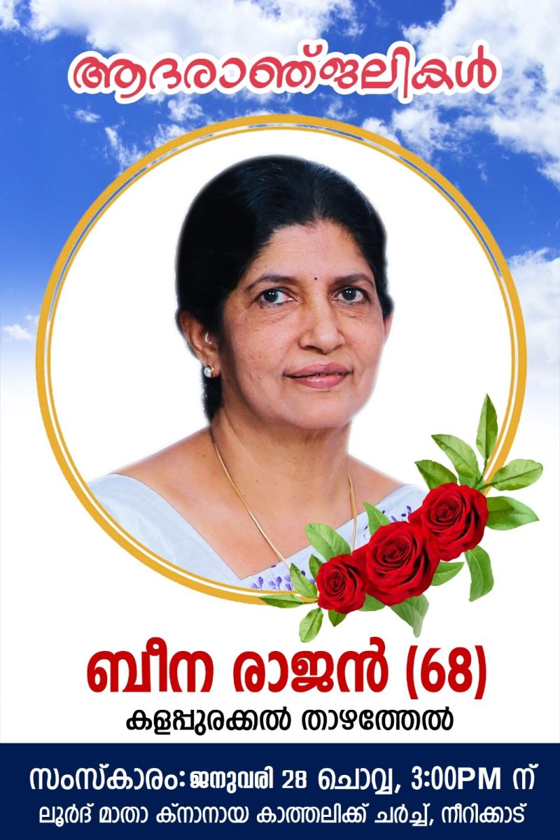 നീറിക്കാട്: കളപ്പുരക്കൽ തോമസ് രാജന്റെ ഭാര്യ ബീന രാജൻ (68) അന്തരിച്ചു . സംസ്കാരം ചൊവ്വാഴ്ച വൈകുന്നേരം (ജനുവരി 28 ) 3 മണിക്ക് നീറിക്കാട് ലൂർദ് മാതാ ക്നാനായ കത്തോലിക്ക ദേവാലയത്തിൽ നടത്തപ്പെടുന്നതാണ്. പരേത മാഞ്ഞുർ സൗത്ത് വടാത്തല കുടുംബാംഗമാണ് .കോട്ടയം അതിരൂപതയിലെ ക്നാനായ കാത്തലിക്ക് വിമൻസ് അസോസിയേഷൻ ജനറൽ സെക്രട്ടറിയായി പ്രവർത്തിച്ചിട്ടുണ്ട് .