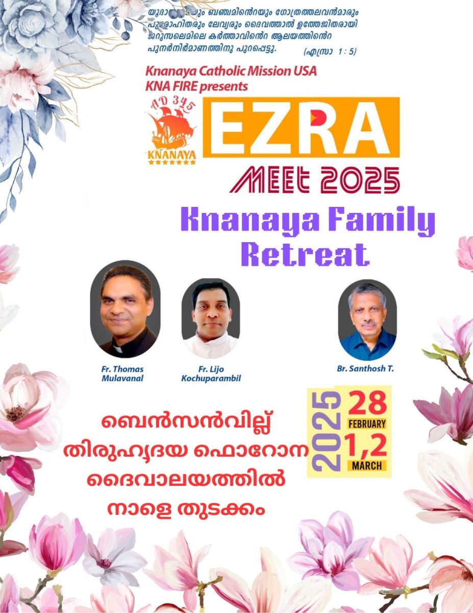 ചിക്കാഗോ: ക്നാനായ റീജിയന്റെ നേതൃത്വത്തിൽ ഒരുക്കുന്ന എസ്രാ മീറ്റ് ഫാമിലി റീട്രീറ്റിന് ബെൻസൻവിൽ തിരുഹൃദയ ക്നാനായ കത്തോലിക്ക ഫെറോന ദൈവാലയത്തിൽ ഇന്ന് തുടക്കമാകും. ക്നാനായ റീജിയൻ ഡയറക്ടർ ഫാ.തോമസ് മുളവനാലിൻറെ മുഖ്യ കാർമ്മികത്വത്തിൽ അർപ്പിക്കുന്ന വി.കുർബ്ബാനയോടെ ധ്യാനം ആരംഭിക്കും.