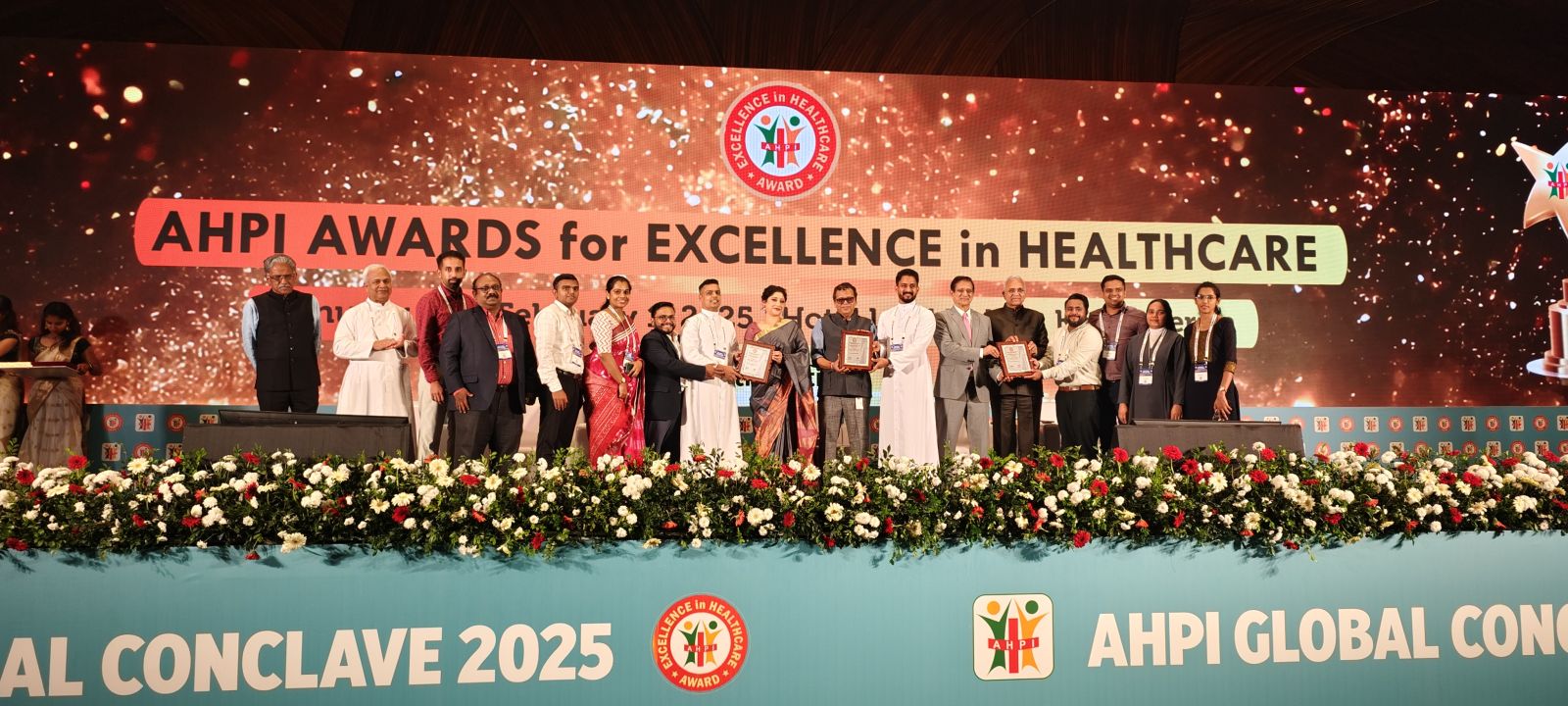 പുരസ്ക്കാര ദാന വേദിയിൽ അസോസിയേഷൻ ഓഫ് ഹെൽത്ത് കെയർ പ്രൊവൈഡേഴ്സ് ഇൻ ഇന്ത്യ (എഎച്ച്പിഐ) രക്ഷാധികാരി ഡോ അലക്സാണ്ടർ തോമസും റിട്ട ഡിജിപി ലോകനാഥ് ബെഹ്റ ഐപിഎസ് ചലച്ചിത്ര താരം ലക്ഷ്മി ഗോപാലസ്വാമിയും ചേർന്ന് ആശുപത്രി ജോയിൻ ഡയറക്ടർമാരായ ഫാ സ്റ്റീഫൻ തേവർപറമ്പിലിനും ഫാ. ജിസ്മോൻ മഠത്തിലിനും ചീഫ് ഓപ്പറേറ്റിങ് ഓഫീസർ ഡോ അജിത്ത് വേണുഗോപാലിനും സമ്മാനിക്കുന്നു. ഡയറക്ടർ ജനറൽ ഡോ ഗിരിധർ ഗനി ,എക്സിക്യൂട്ടീവ് ഡയറക്ടർ ഫാ ജോൺസൺ വാഴപ്പിള്ളി , എന്നിവർ സമീപം.