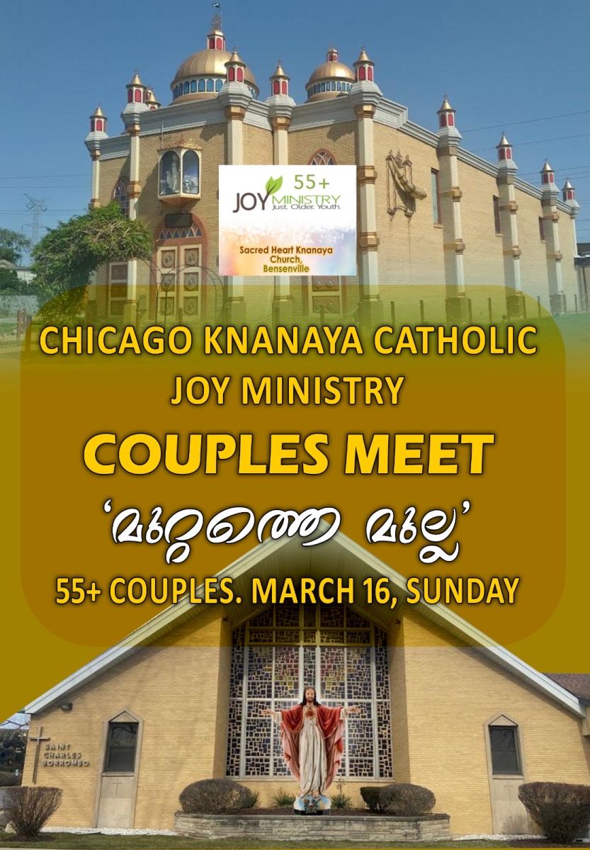 ചിക്കാഗോ: ബെൻസൻവിൽ തിരുഹൃദയ ക്നാനായ കത്തോലിക്ക ഫൊറോന ദൈവാലയത്തിന്റെയും സെന്റ് മേരീസ് ക്നാനായ കത്തോലിക്ക ദൈവാലയത്തിന്റെയും സംയുക്ത നേതൃത്വത്തിൽ 55 വയസ്സിന് മേൽ പ്രായമുള്ള ദമ്പതികളുടെ സംഗമം ബെൻസൻവിൽ ഇടവകയിൽ വച്ച് നടത്തപ്പെടുന്നു. അമ്പത് നോയമ്പിന്റെ നിറവിൽ മുതിർന്നവർക്കായുളള ഒരു ആത്മിയ ഒത്തുചേരലാണ് " മുറ്റത്തെ മുല്ല" എന്ന പേരിലുള്ള സംഗമം. മുറ്റത്തെ മുല്ലയ്ക്ക് മണമില്ല എന്ന് നാം കൂട്ടിവായ്ക്കുമ്പോൾ അവർക്ക് ഗുണമുണ്ട് എന്ന പ്രഘോഷണമാണ് ഇവരുടെ ഒത്തുചേരൽ. കോട്ടയം കളത്തിപ്പിടി ക്രിസ്റ്റീൻ ധ്യാനകേന്ദ്രം ഡയറക്ടർ ബ്രദർ സന്തോഷ് സംഗമത്തിന് നേതൃത്വം നൽകും. മാർച്ച് 16 ഞായർ രാവിലെ 10 മണിക്ക് കുർബ്ബാനയോടെ ആരംഭിച്ച് വൈകുന്നേരം 4 മണിക്ക് സമാപിക്കും. ബെൻസൻവിൽ ഇടവകയിലെ മുതിർന്നവരുടെ ഭക്തസംഘടനയായ "ജോയ്" മിനിസ്ട്രി ടീം അംഗങ്ങൾ സംഗമത്തിന് നേതൃത്വം നൽകും.