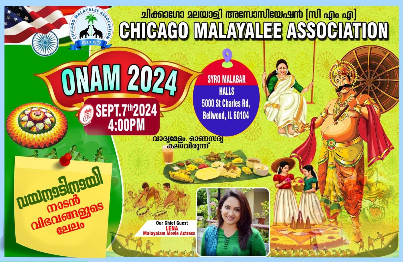 ചിക്കാഗോ മലയാളി അസോസിയേഷന്റെ ഓണാഘോഷങ്ങൾ സെപ്റ്റംബർ 7th ന് ബെൽവുഡ് സീറോ മലബാർ ഓഡിറ്റോറിയത്തിൽ വച്ച് വെെകുന്നേരം നാലിന് ഓണസദ്യയോടെ ആരംഭിക്കുന്നതാണ്.