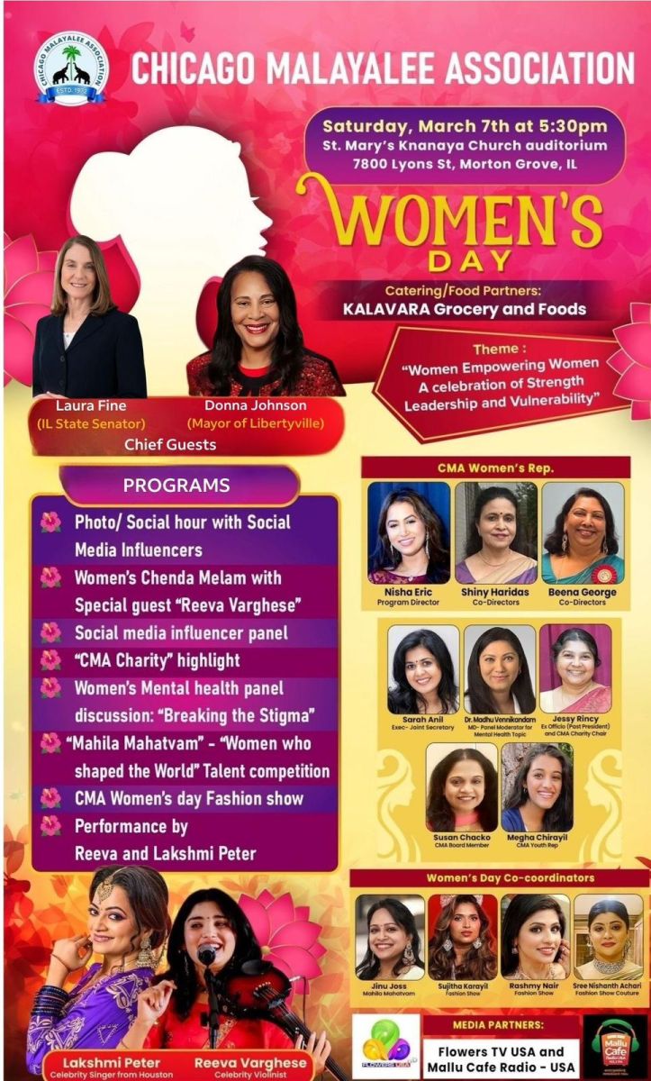 ചിക്കാഗോ :ചിക്കാഗോ മലയാളീ അസോസിയേഷന്റെ ആഭിമുഖ്യത്തിലുള്ള വിമൻസ് ഡേ ആഘോഷങ്ങൾ മാർച്ച് 7 ശനിയാഴ്ച (നാളെ ) വൈകിട്ട് 5.30ന് മോർട്ടൻ ഗ്രോവിലുള്ള സെന്റ് മേരീസ് ക്നാനായ ചർച്ച് ഓഡിറ്റോറിയത്തിൽ വെച്ച് നടക്കും .ഈ ആഘോഷ പരിപാടികളുടെ എല്ലാ ഒരുക്കങ്ങളും പൂർത്തിയായതായി വിമൻസ് ഫോറം ചെയർപേഴ്സൺ നിഷ എറിക് ,കോ ചെയർ പേഴ്സൺമാരായ ഷൈനി ഹരിദാസ് ,ബീന ജോർജ് എന്നിവർ അറിയിച്ചു .