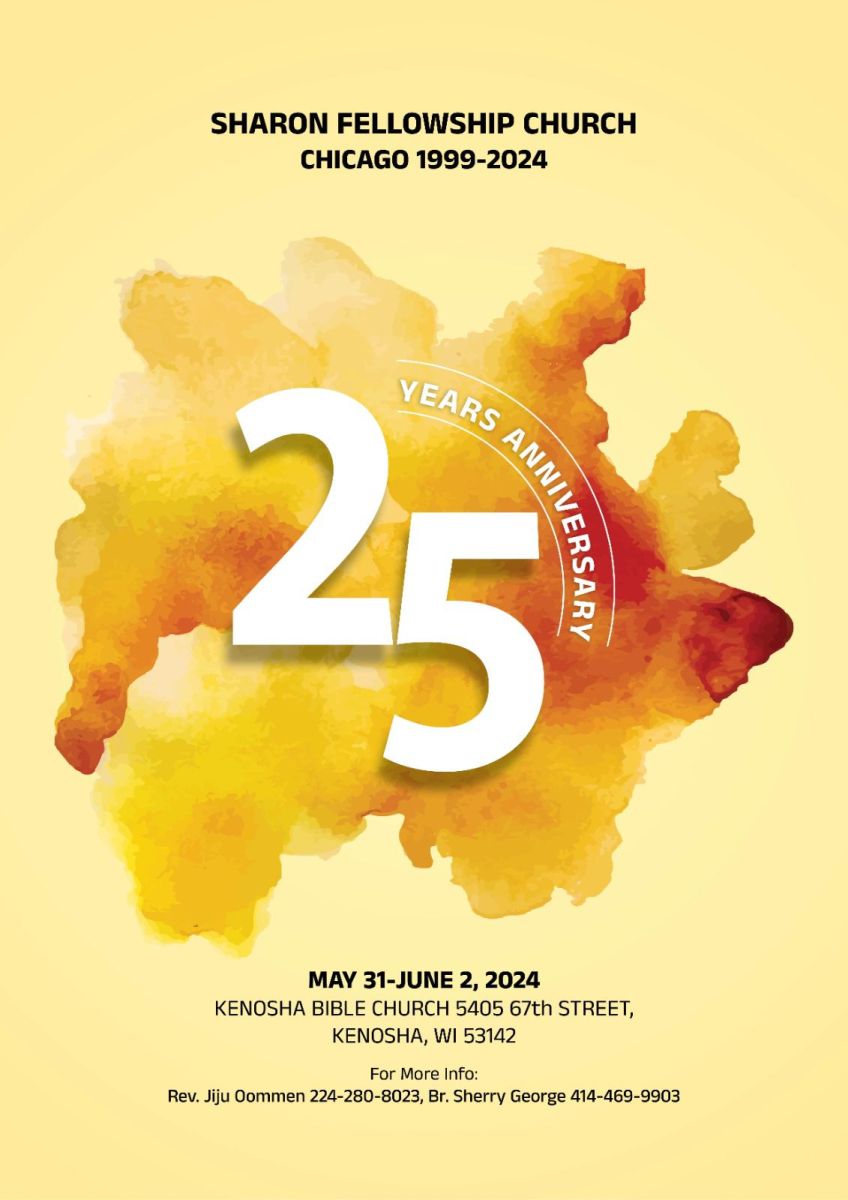 ചിക്കാഗോയിൽ ശാരോൻ ഫെല്ലോഷിപ്പ് ചർച്ചിന്റെ പ്രവർത്തനം ആരംഭിച്ചിട്ട് 25 വർഷം പൂർത്തിയാക്കുന്നതിന്റെ ഭാഗമായി കൺവെൻഷനും പ്രത്യേക സ്തോത്ര ശുശ്രൂഷ സമ്മേളനവും മെയ് 31 മുതൽ ജൂൺ 2 വരെ കെനോഷാ ബൈബിൾ ചർച്ചിൽ വെച്ച് നടക്കുമെന്ന് ഭാരവാഹികൾ അറിയിച്ചു. ജൂൺ ഒന്നാം തിയതി ശനിയാഴ്ച വൈകിട്ടു നടക്കുന്ന പ്രത്യേക സമ്മേളനത്തിൽ കെനോഷാ സിറ്റി മേയർ ഡേവിഡ് ബോഗ്ഡോള ഉൾപ്പെടെയുള്ള വിശിഷ്ട അതിഥികൾ പങ്കെടുക്കും. സിൽവർ ജൂബിലി തീം സോങ് കോയർ അവതരിപ്പിക്കും. സഭയുടെ ചരിത്രം അടങ്ങിയ സുവനീർ ഈ സമ്മേളനത്തിൽ പ്രകാശനം ചെയ്യും.