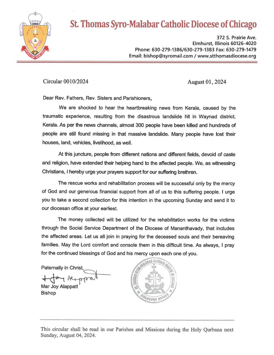 ഈ ദുരന്തത്തില് എല്ലാം നഷ്ടപ്പെട്ടവര്ക്ക് കൈത്താങ്ങാകുവാന് ജാതിമത ഭേദമെന്യേ എല്ലാവരും കഴിവുപോലെ പരിശ്രമിക്കണം. വിഷമംപിടിച്ച ഈ സാഹചര്യത്തില് സാമ്പത്തികമായി സഹായിക്കുകയെന്നുള്ളത് നമ്മുടെ കടമയായി കരുതി അടുത്ത ഞായറാഴ്ചത്തെ വയനാട് ദുരന്ത സഹായ ഫണ്ടിലേക്ക് എല്ലാവരും കഴിവിന്റെ പരമാവധി സംഭാവനകള് നല്കണമെന്ന് മാര് ജോയി ആലപ്പാട്ട് അഭ്യര്ത്ഥിച്ചു.