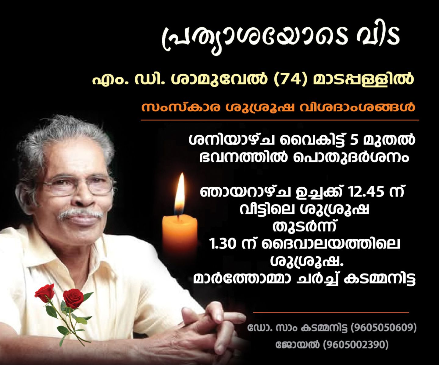 ഡോ . സാം കടമ്മനിട്ടയുടെ പിതാവ്, കടമ്മനിട്ട മാടപ്പള്ളിൽ ശ്രീ. എം. ഡി. ശാമുവേൽ, 74 (വിമുക്ത ഭടൻ) അന്തരിച്ചു. സംസ്കാരം ഡിസംബർ 15 ഞായർ ഉച്ചക്ക് 1.30ന് മാർത്തോമ്മാ പള്ളിയിൽ അഭിവന്ദ്യ ഡോ. യുയാക്കിം മാർ കൂറിലോസ് സഫ്രഗൻ മെത്രാപ്പോലീത്തയുടെ കാർമ്മികത്വത്തിൽ നടത്തപ്പെടും. ശനിയാഴ്ച വൈകുന്നേരം 5:00 മണിക്ക് ഭൗതീക ശരീരം കടമ്മനിട്ടയിലെ ഭവനത്തിൽ എത്തിക്കും. ഞായറാഴ്ച 12:45 നു ഭവനത്തിൽ വച്ചുള്ള ശുശ്രുഷകൾ ആരംഭിക്കും. തുടർന്ന് ദൈവാലയത്തിലേക്കുള്ള അന്ത്യയാത്ര.