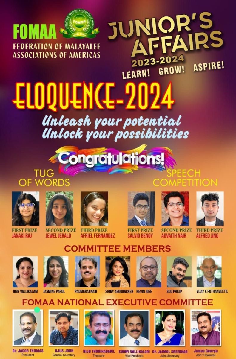 ഷിക്കാഗോ : ഫോമാ ജൂനിയർ അഫയേഴ്സ് കമ്മറ്റിയുടെ ആഭിമുഖ്യത്തിൽ ഗ്രേഡ് 5 മുതൽ ഗ്രേഡ് 12 വരെയുള്ള സ്കൂൾ കുട്ടികൾക്കായി എലോക്വൻസ് 2024 എന്ന പേരിൽ നടത്തപ്പെട്ട മത്സരം വൻവിജയം, അഞ്ചാം ക്ളാസ് മുതൽ ഏഴാം ക്ളാസ് വരെയുള്ള കുട്ടികൾക്കായി ടഗ് ഓഫ് വേഡ്സും സിനോനിം ഗെയ്മും ചേർന്നുള്ള മത്സരവും എട്ടാം ക്ളാസ്സു മുതൽ പന്ത്രണ്ടാം ക്ളാസ്സു വരെയുള്ള കുട്ടികൾക്കായി പ്രസംഗമത്സരവുമാണ് അരങ്ങേറിയത്, പ്രിലിമിനറി റൌണ്ട്, സെമി ഫൈനൽ റൌണ്ട്, ഫൈനൽ റൌണ്ട് എന്നിങ്ങനെ മൂന്നു റൗണ്ടുകളിലായി നടന്ന വാശിയേറിയ മത്സരങ്ങളിലാണ് വിജയികളെ കണ്ടെത്തിയത്, ഫൈനൽ മത്സരങ്ങളിൽ ഓരോ വിഭാഗത്തിലും ഏഴു മത്സരാർഥികൾ വീതം മാറ്റുരച്ചു, അവസാനം ടഗ് ഓഫ് വേഡ്സ് വിഭാഗത്തിൽ ഫ്ലോറിഡയിൽ നിന്നുള്ള ജാനകി രാജ് ഒന്നാം സ്ഥാനവും രണ്ടും മൂന്നും സ്ഥാനങ്ങളിൽ ന്യൂ ജേഴ്സിയിൽ നിന്നുള്ള ജ്യൂവൽ ജറാൾഡ്, അഫ്രിയൽ ഫെർണാണ്ടസ് എന്നിവരും കരസ്ഥമാക്കി.
