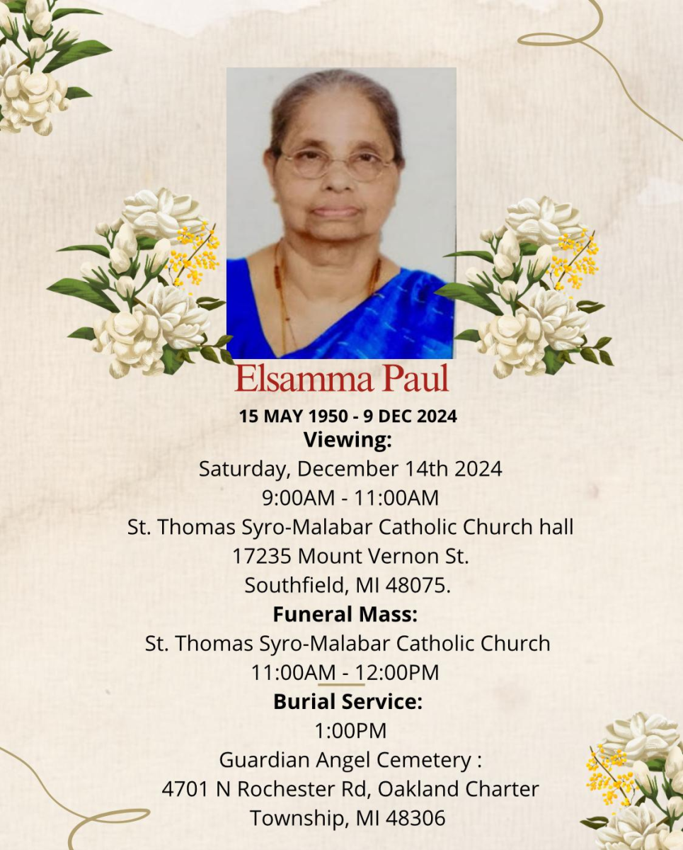 പൊതുദർശനം സൗത്ത് ഫീൽഡിൽ ഉള്ള സെന്റ് തോമസ് സീറോ മലബാർ കാത്തലിക് ചർച്ച് ഹാളിൽ ശനിയാഴ്ച രാവിലെ 9 മുതൽ 11 മണി വരെ ഉണ്ടായിരിക്കും . തുടർന്ന് 11 മണിക്ക് ശവസംസ്കാര ശുശ്രൂഷകൾ ആരംഭിക്കും. ഓക്ലാൻഡ് ചാർട്ടർ ടൗൺഷിപ്പിലുള്ള ഗാർഡിയൻ ഏഞ്ചൽ സെമിത്തേരിയിൽ ആയിരിക്കും സംസ്കാരം നടക്കുക.