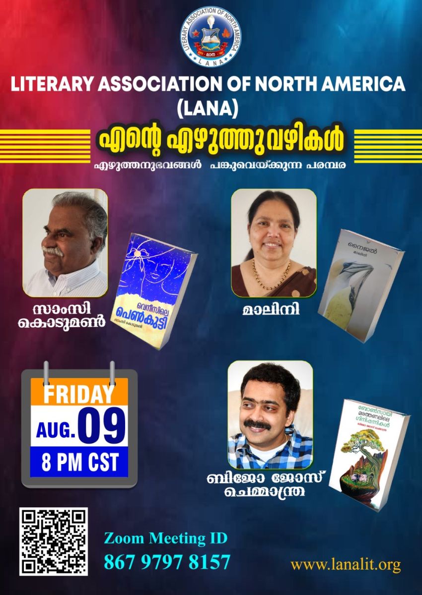 ലിറ്റററി അസോസ്സിയേഷൻ ഓഫ് നോർത്ത് അമേരിക്ക (ലാന) -യുടെ 2024-25 വർഷത്തിൽ സംഘടിപ്പിക്കുന്ന “എന്റെ എഴുത്തുവഴികൾ” എന്ന എഴുത്തുകാരുടെ എഴുത്തനുഭവങ്ങൾ പങ്കുവയ്ക്കുന്ന പരമ്പരയുടെ പ്രഥമ പരിപാടി ആഗസ്റ്റ് 9 വെള്ളിയാഴ്ച്ച വൈകീട്ട് (8PM CST/9PM EST/6PM PST) സൂമിലുടെ നടക്കും. പങ്കെടുക്കുന്ന എഴുത്തുകാർ അവരുടെ രചനകളെക്കുറിച്ചും, രചനാനുഭവങ്ങളെക്കുറിച്ചും, രചനക്ക് കാരണമായ പ്രചോദനങ്ങളെക്കുറിച്ചുമെല്ലാം പ്രതിപാദിക്കുകയും ചർച്ച ചെയ്യുകയും ചെയ്യുന്ന പരിപാടൊയാണ് “എന്റെ എഴുത്തുവഴികൾ” .