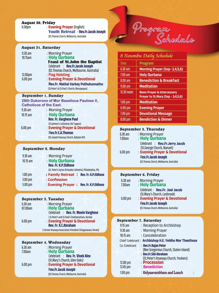 സെപ്റ്റംബർ അഞ്ചാം തീയതി വ്യാഴം രാവിലെ 6.30ന് പ്രഭാത പ്രാർത്ഥന, 7:00 മണിക്ക് വിശുദ്ധ കുർബാന (റവ ഫാ ജെറി ജേക്കബ്), വൈകീട്ട് 6:00 മണിക്ക് സന്ധ്യാ പ്രാർത്ഥന, സുവിശേഷ പ്രസംഗം റവ ഫാ ജേക്കബ് ജോസഫ്.