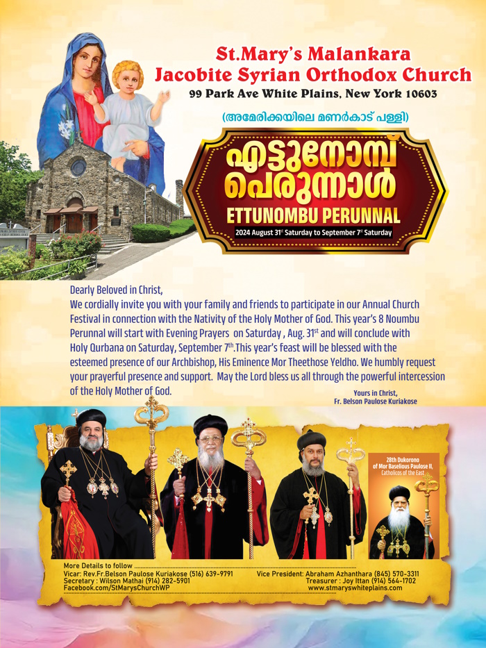 ന്യൂയോര്ക്ക്: വൈറ്റ് പ്ലെയിന്സ് സെന്റ് മേരീസ് യാക്കോബായ സുറിയാനിപ്പള്ളിയില് വിശുദ്ധ ദൈവമാതാവിന്റെ ജനന പെരുന്നാളിനോടനുബന്ധിച്ച് ആണ്ടുതോറും നടത്തപ്പെടാറുള്ള എട്ടു നോമ്പാചരണവും, പുണ്യ ശ്ലോകനായ ബസേലിയോസ് പൗലോസ് ദ്വിതീയൻ കാതോലിക്കാ ബാവായുടെ ഇരുപത്തിഎട്ടാമത് ദുഖ്റോനോ പെരുന്നാളും, ഇടവകയുടെ വലിയ പെരുന്നാളും ആഗസ്റ്റ് 31 ശനിയാഴ്ച മുതല് സെപ്റ്റംബർ 7 ശനിയാഴ്ച വരെ എട്ടു ദിവസങ്ങളിലായി ഭക്തി ആദരപൂർവം നടത്തപ്പെടുന്നു.
