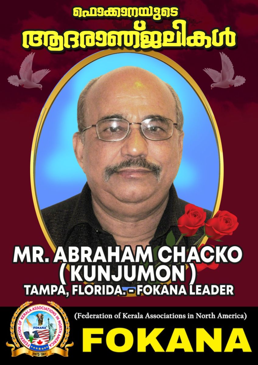 ഫൊക്കാന ലീഡർ എബ്രഹാം പി ചാക്കോയുടെ (കുഞ്ഞുമോൻ )നിര്യാണത്തിൽ ഫൊക്കാനയുടെ ആദരാഞ്ജലികൾ . ഫൊക്കാനയുടെ സന്തതസഹചാരിയും, പല കൺവെൻഷനുകളുടെയും സ്ഥാനങ്ങളും, വഹിച്ചിട്ടുള്ള വ്വെക്തികൂടിയാണ് അദ്ദേഹം . ഫൊക്കാനയുടെ മിക്കവാറും എല്ലാ കൺവെൻഷനുകളിലും പങ്കെടുക്കാറുള്ള അദ്ദേഹം തന്റെ വല്ലായ്മകൾ അവഗണിച്ചു വീൽചെയറിൽ കഴിഞ്ഞ ഫൊക്കാന ഫ്ലോറിഡ കൺവെൻഷനിൽ പങ്കടുത്ത അദ്ദേഹത്തെ ഏവരും ഓർക്കുന്നുണ്ട്.