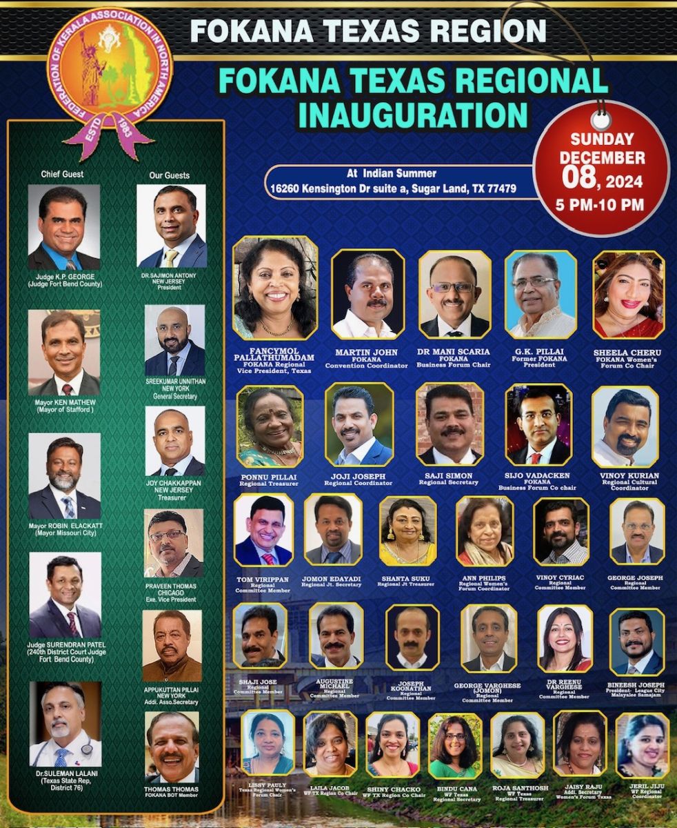 ടെക്സാസ് നോര്ത്ത് അമേരിക്കയിലെ മലയാളി സംഘടനകളുടെ സംഘടനയായ ഫൊക്കാനയുടെ പ്രബല റീജിയനുകളിൽ ഒന്നായ ടെക്സാസ് റീജിയന്റെ പ്രവർത്തന ഉൽഘാടനം 2024 ഡിസംബർ 8 ആം തീയതി ഞയറാഴ്ച വൈകുന്നേരം 5 മണി മുതൽ ഷുഗർലാൻഡിലുള്ള ഇന്ത്യൻ സമ്മർ റെസ്റ്റോറേന്റിൽ (16260 Kinsington Dr , Suite A Sugar land , TX 77479 )വെച്ച് വിപുലമായ പരിപാടികളോട് നടത്തുന്നതാണ് എന്ന് റീജണൽ വൈസ് പ്രസിഡന്റ് ഫാൻസിമോൾ പള്ളത്തുമഠം അറിയിച്ചു.