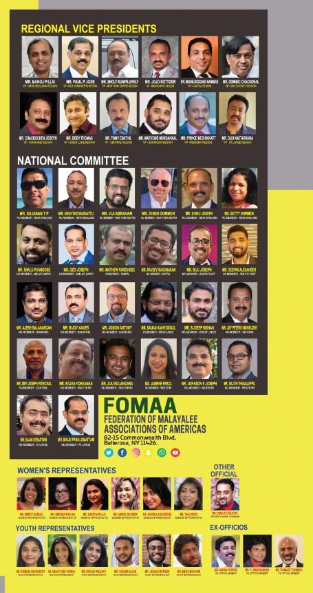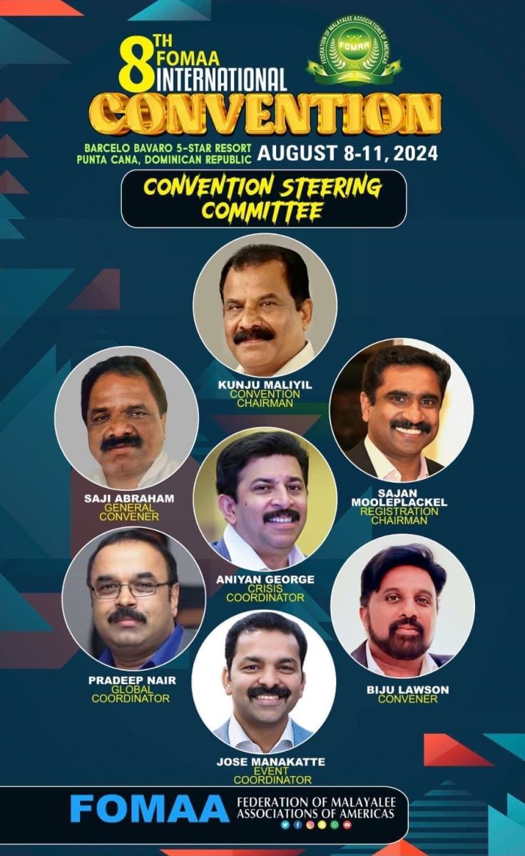 ഫോമാ പ്രസിഡണ്ട് ഡോ. ജേക്കബ് തോമസ്, ജനറല് സെക്രട്ടറി ഓജസ് ജോണ്, ട്രഷറര് ബിജു തോണിക്കടവില്, വൈസ് പ്രസിഡണ്ട് സണ്ണി വള്ളിക്കളം, ജോയിന്റ് സെക്രട്ടറി ഡോ. ജെയ്മോള് ശ്രീധര്, ജോയിന്റ് ട്രഷറര് ജെയിംസ് ജോര്ജ്, കണ്വന്ഷന് ചെയര്മാന് കുഞ്ഞ് മാലിയില്, ഫോമാ മുന് പ്രസിഡണ്ട് അനിയന് ജോര്ജ്, ജനറല് കണ്വീനര് സജി അബ്രഹാം, പ്രദീപ് നായർ , സാജന് മൂലേ പ്ലാക്കല്, പീറ്റര് കുളങ്ങര, ജോണ് പാട്ടപ്പതി, ജോസ് മണക്കാട്ട്, ബിജു ലോസണ് തുടങ്ങിയവര് കണ്വന്ഷന്റെ വിജയത്തിനായി പ്രവര്ത്തിക്കുന്നു.