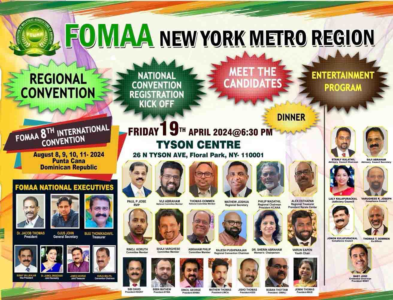 ന്യൂയോർക്ക്: അമേരിക്കയിലെ മലയാളീ സംഘടനകളുടെ ഏറ്റവും വലിയ സംഘടനയായ ഫോമായുടെ ന്യൂയോർക്ക് മെട്രോ റീജിയൺ കൺവെൻഷൻ 19-ന് വെള്ളിയാഴ്ച വൈകിട്ട് 6:30 മുതൽ പ്രൗഡ്ഢ ഗംഭീരമായി നടത്തുവാനുള്ള ക്രമീകരണങ്ങൾ പൂർത്തിയായി. ഫ്ലോറൽ പാർക്കിലുള്ള ടൈസൺ സെന്ററിൽ (26 North Tyson Avenue, Floral Park, New York, 11001) ഫോമാ ഭാരവാഹികളുടെയും സാമൂഹിക-സാംസ്കാരിക രംഗത്തെ പ്രമുഖരുടെയും നിറ സാന്നിധ്യത്തിൽ വിവിധ കലാപരിപാടികളോടെ നടത്തുവാനാണ് ക്രമീകരിച്ചിരിക്കുന്നത്. മെട്രോ റീജിയണൽ വൈസ് പ്രസിഡൻറ് (RVP) പോൾ ജോസിന്റെ നേതൃത്വത്തിലുള്ള സംഘാടക സമിതിയാണ് കൺവെൻഷൻ നടത്തിപ്പിനുള്ള ചുമതല വഹിക്കുന്നത്.