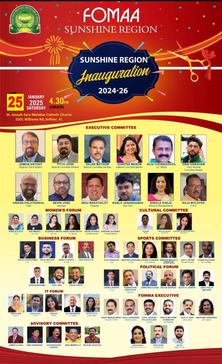 ഫ്ളോറിഡ: അമേരിക്കന് മലയാളികളുടെ പ്രമുഖ ദേശീയ സംഘടനയായ ഫോമ സണ്ഷൈന് റീജിയന്റെ (ഫ്ളോറിഡ) 2024-2026 പ്രവര്ത്തനോദ്ഘാടനം ജനുവരി 25-ന് ശനിയാഴ്ച വൈകുന്നേരം 4.30-ന് സെന്റ് ജോസഫ് സീറോമലബാര് കാത്തലിക് ചര്ച്ച് ഓഡിറ്റോറിയത്തില് (5501 ണശഹഹശമാെ ഞീമറ, ടലളളിലൃ, എഘ) വെച്ച് നടത്തപ്പെടും.