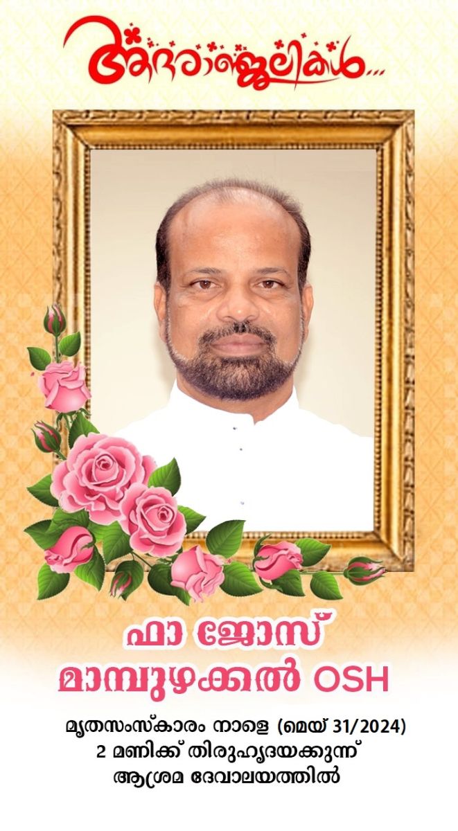 ഇന്നലെ അന്തരിച്ച ബഹു. മാമ്പുഴക്കൽ ജോസ് അച്ചന്റെ മൃതശരീരം നാളെ (മെയ് 31 ) രാവിലെ 7 മണിക്ക് കാരിത്താസ് മോർച്ചറിയിൽനിന്നും തിരിഹൃദയകുന്നാശ്രമത്തിൽ കൊണ്ടുവരും. മൃതസംസ്കാര ശുശ്രൂഷകൾ ഉച്ചകഴിഞ്ഞ് 2 മണിക്ക് ആശ്രമത്തിൽ ആരംഭിക്കും. മൃതസംസ്കാര ശുശ്രുഷയുടെ രണ്ടാം ഭാഗം അഭിവന്ദ്യ ജോസഫ് പണ്ടാരശ്ശേരിൽ പിതാവിന്റെ കാർമികത്വത്തിൽ ആശ്രമത്തിൽ വച്ചും തുടർന്ന് മൂന്നാം ഭാഗം വി. കുർബാനയോടുകൂടി തിരുഹൃദയക്കുന്ന് ആശ്രമദേവാലയത്തിൽ കോട്ടയം അതിരൂപതാദ്ധ്യക്ഷൻ അഭിവന്ദ്യ മാർ മാത്യു മൂലക്കാട്ട് മെത്രാപോലീത്തയുടെ മുഖ്യ കാർമികത്വത്തിൽ നടത്തപ്പെടുന്നതാണ്.
