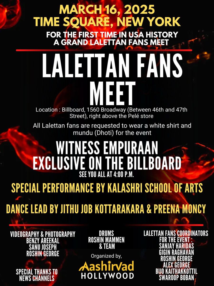 'എമ്പുരാന്റെ' റിലീസിനോടനുബന്ധിച്ച് ടൈംസ് സ്ക്വയറിൽ വിഡിയോ വാളിൽ ചിത്രത്തിന്റെ ട്രെയിലർ മാർച്ച് 16 ഞായറാഴ്ച പ്രദർശിപ്പിച്ചിരുന്നു. അമേരിക്കയിലെ ലാലേട്ടൻ ഫാൻസിന്റെ ഏറ്റവും വലിയ ഈ ഒത്തുകൂടലിൽ എല്ലാവരും വെള്ള ഷർട്ടും മുണ്ടുമണിഞ്ഞാണ് പങ്കെടുത്തത് . ആശിർവാദ് ഹോളിവുഡ് ആണ് ഈ ഒത്തുചേരൽ ഒരുക്കിയത് .റോഷിൻ ജോർജും മക്കളുമെല്ലാം ചേർന്ന് സംഗതി വേറെ ലെവലാക്കി. കിടു പെർഫോമൻസ്, അന്നത്തെ ആ വൈബ് ഒന്ന് കാണേണ്ടത് തന്നെയായിരുന്നു.