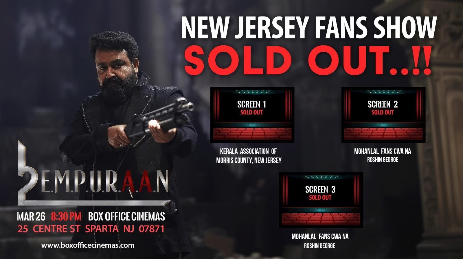 എമ്പുരാൻ റിലീസ് ഡേ ആഘോഷമാക്കാൻ ആശീർവാദ് സിനിമാസ് ആവശ്യപ്പെട്ടതുപോലെ ഇവിടെ ന്യൂ ജേഴ്സിയിലും മോഹൻലാൽ ഫാൻസ്, ബ്ലാക്ക് ആൻഡ് ബ്ലാക്ക് ഡ്രെസിൽ കിടിലൻ വൈബിലാണ് എത്തിയത് . പാട്ടും മേളവും ഡാൻസും പോസ്റ്ററുകളും ബാനറുകളും സ്റ്റിക്കറുകളും എല്ലാം കൂടി സംഗതി ആകെ കളറായി. മോഹൻ ലാൽ ഫാൻസ് അസോസിയേഷൻ നോർത്ത് അമേരിക്ക- ഒരു ഡയറക്ടർ ആയ റോഷിൻ ജോർജും ന്യൂ ജേഴ്സി ചാപ്റ്ററും ചേർന്നൊരുക്കിയ 'എമ്പുരാന്' റിലീസ് ഒരുക്കങ്ങൾ ന്യൂജേഴ്സിയിൽ തീർത്ത ആവേശം കാണേണ്ടത് തന്നെയായിരുന്നു. പാട്ട് പാടി മോഹൻലാൽ ജയ് വിളിച്ച് ഡാൻസ് കളിച്ച് ആഘോഷമായിട്ടായിരുന്നു ന്യൂ ജേഴ്സിയിലെ സ്പാർട്ടയിലേക്ക് ഫാൻസിന്റെ വരവ് . അമേരിക്കൻ തീയേറ്ററായിരുന്നിട്ട് കൂടി ഇന്റെർവെലിൽ പഴം പൊരിയും നൽകിയത് ഷോ കൊഴുപ്പിച്ചു .ആദ്യഷോയിൽ ഇവിടുത്തെ 3 തിയേറ്ററുകളിലെയും എല്ലാ ഷോയും ഫുളി പായ്ക്ഡ് ആയിരുന്നു.