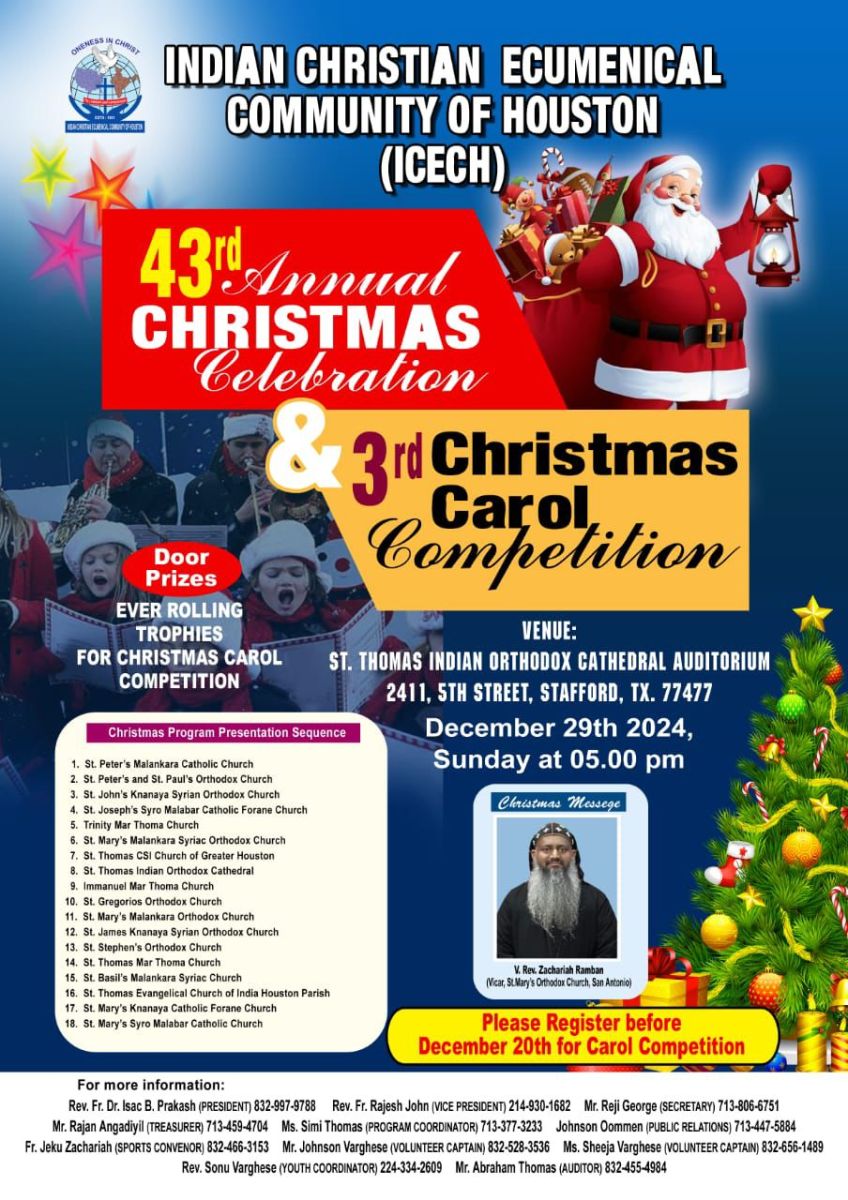 ഹൂസ്റ്റൺ: ഇന്ത്യൻ ക്രിസ്ത്യൻ എക്യൂമിനിക്കൽ കമ്യൂണിറ്റി ഓഫ് ഹൂസ്റ്റണിന്റെ (ICECH) ആഭിമുഖ്യത്തിൽ ക്രിസ്തുമസ് കരോൾ സർവീസും മൂന്നാമത് കരോൾ ഗാന മൽസരവും വിപുലമായ പരിപാടികളോടെ നടത്തപ്പെടും.