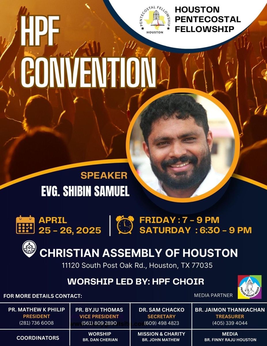ഹൂസ്റ്റൺ: ഹൂസ്റ്റൺ പെന്തെക്കൊസ്തൽ ഫെലോഷിപ്പിന്റെ ആഭിമുഖ്യത്തിൽ ഈ വർഷത്തെ കൺവൻഷൻ ഏപ്രിൽ 25, 26 തീയതികളിൽ ക്രിസ്ത്യൻ അസംബ്ലി ഓഫ് ഹൂസ്റ്റൺ (11120 South Post Oak Rd., Houston, TX 77035) വച്ച് നടക്കും.