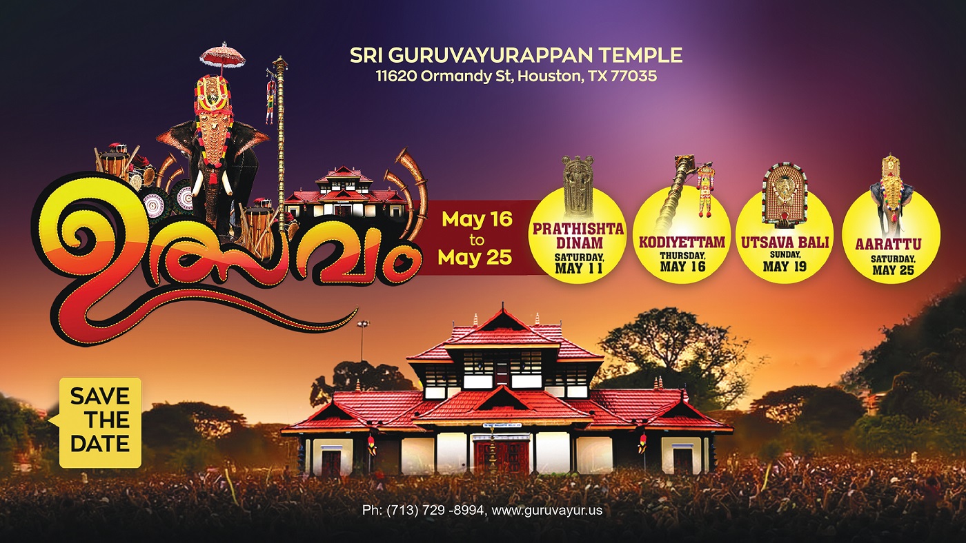 ഹൂസ്റ്റൺ ഗുരുവായൂർ ക്ഷേത്ര ഉൽസവം സമാനതകളില്ലാത്ത ആവേശത്തോടെ ആഘോഷിക്കപ്പെടുന്നു, രാജ്യത്തിനകത്തും പുറത്തും നിന്നുള്ള ഭക്തരെ ആകർഷിക്കുന്നു. ചടങ്ങുകൾ, ഘോഷയാത്രകൾ, സാംസ്കാരിക പ്രകടനങ്ങൾ, കേരളത്തിൻ്റെ സമ്പന്നമായ പൈതൃകത്തിൻ്റെ ഊർജ്ജസ്വലമായ പ്രദർശനം എന്നിവയാൽ നിറഞ്ഞുനിൽക്കുന്ന ഉത്സവം സാധാരണയായി 10 ദിവസങ്ങൾ നീണ്ടുനിൽക്കും. മെയ് 16 ശനിയാഴ്ച ആരംഭിച്ചു മെയ് 25 വരെ നീണ്ടുനിൽക്കുന്ന ഈ ആഘോഷ വേള സമ്പന്നമാക്കാൻ എല്ലാ സനാതനധർമ വിശ്വാസികളെയെയും സഹർഷം സ്വാഗതം ചെയ്യുന്നു. .