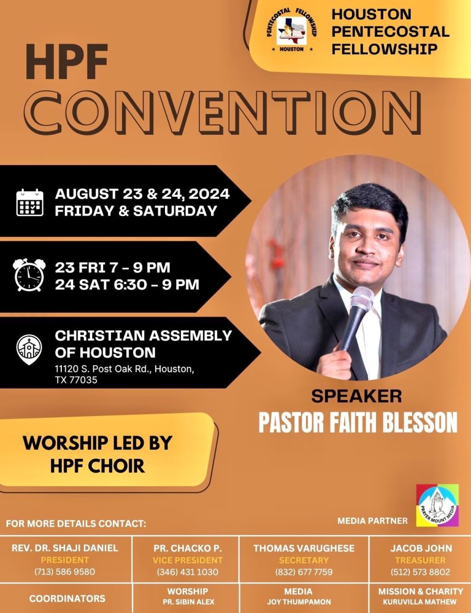 അമേരിക്കയിലെ വിവിധ പട്ടണങ്ങളില് നടക്കുന്ന കോണ്ഫറന്സുകളിലും കണ്വന്ഷനുകളിലും പ്രസംഗിക്കാന് കേരളത്തില് എത്തിയ പാസ്റ്റര് ഫെയ്ത്ത് ബ്ലസ്സന് മുഖ്യ പ്രഭാഷണങ്ങള് നടത്തും. എച്ച്.പി.എഫ് ക്വയര് ഗാനങ്ങള് ആലപിക്കും.