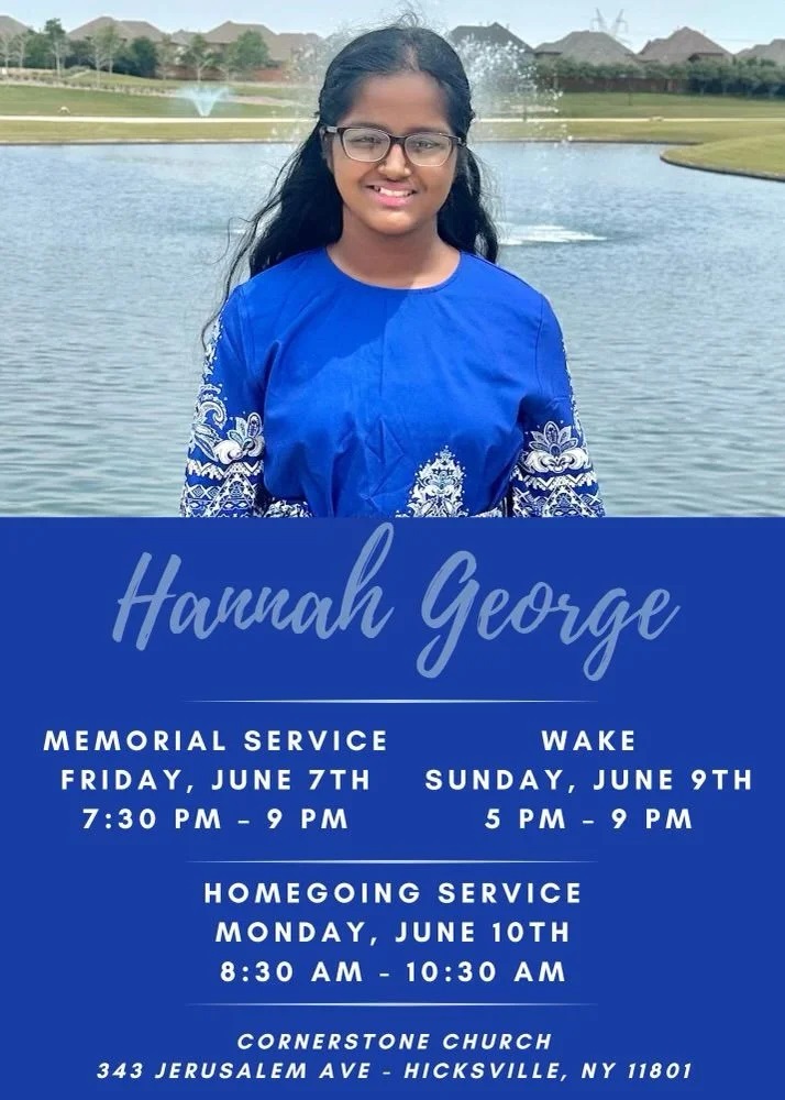 ന്യു യോർക്ക്: ഹന്ന ജോർജ്ജ്, 16, ന്യു യോർക്കിൽ അന്തരിച്ചു. Visitation at Main Service: ജൂൺ 9 ഞായറാഴ്ച, 5:00 pm - 9:00 pm: കോർണർസ്റ്റോൺ ചർച്ച്, 343 ജറുസലേം അവന്യൂഹിക്സ്വിൽ , ന്യൂയോർക്ക്.