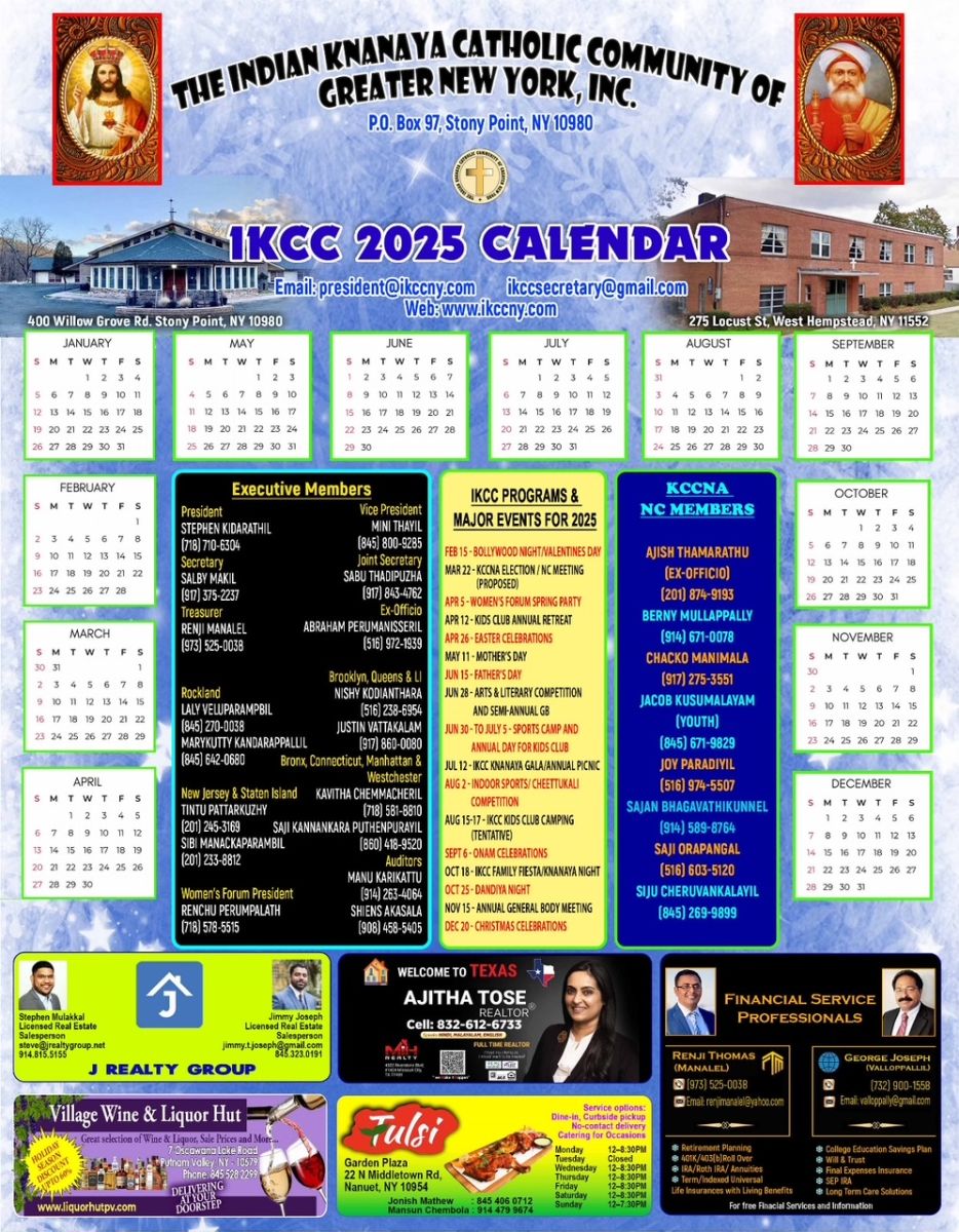 IKCC എക്സിക്യൂട്ടീവ് കമ്മിറ്റി 2025 വർഷത്തേക്കുള്ള കലണ്ടർ പ്രകാശനം ചെയ്തു. ക്യുൻസ്/ലോങ്ങ് ഐലണ്ടിലായ് ഡിസംബർ ഒന്നാം തിയതി നടന്ന ക്രിസ്മസ് കരോൾ ഉൽഘാടന വേദിയിലാണ് പ്രകാശനം. IKCC വരാൻ പോകുന്ന President സ്റ്റീഫൻ കിടാരത്തിൽ സ്വാഗത പ്രസംഗം നടത്തി. ഇപ്പോഴത്തെ പ്രസിഡന്റ് എബ്രഹാം പെരുമനിശ്ശേരിൽ അധ്യക്ഷ പ്രസംഗം നടത്തി. BQLI ബിൽഡിംഗ് ബോർഡ് president എബ്രഹാം പെരുമ്പളത് കലണ്ടറിന്റെ പ്രകാശനം നടത്തി. സെക്രട്ടറി സാൽബി മാക്കിൽ, ജോയിന്റ് സെക്രട്ടറി സാബു തടിപ്പുഴ, ട്രെഷറര് രഞ്ജി മണലേൽ, എക്സിക്യൂട്ടീവ് മെമ്പർ ജസ്റ്റിൻ വട്ടക്കളം, നാഷണൽ കൌൺസിൽ മെംബേർസ് സജി ഒരപ്പാങ്കൽ, ജോയി പാറടിയിൽ എന്നിവർ ചടങ്ങുകൾക്കു നേതൃത്വം നൽകി. വരും വർഷത്തേക്കുള്ള പ്രോഗ്രാമുകളും ഇവെന്റുകളും അടങ്ങിയതാണ് കലണ്ടർ 2025. വരും വർഷത്തെ എക്സിക്യൂട്ടീവിന്റെ കോൺടാക്ട് ഇൻഫർമേഷൻ മറ്റു വിശദംശങ്ങൾ എന്നിവയും പുതിയ കലണ്ടറീൽ ഉൾപ്പെടുത്തിയിട്ടുണ്ട്. അതനുസരിച്ചു എല്ലാവരും എല്ലാ ഇവെന്റുകളിലും പങ്കെടുത്തു വിജയിപ്പിക്കണമെന്ന് എക്സിക്യൂട്ടീവ് കമ്മിറ്റി ആഹ്വാനം ചെയ്തു. കലണ്ടറിന്റെ സ്പോൺസർമാരായ രഞ്ജി മണലേൽ, ജോർജ് ജോസഫ്, അജിത കണ്ടാരപ്പള്ളിൽ, ജോണിഷ് പലനിക്കുമുറിയിൽ, സ്റ്റീഫൻ മുളക്കൽ, ലാജൻ ചെമ്മലകുഴി എന്നിവർക്കു IKCC പ്രേത്യേകം നന്ദി അറിയിച്ചു.