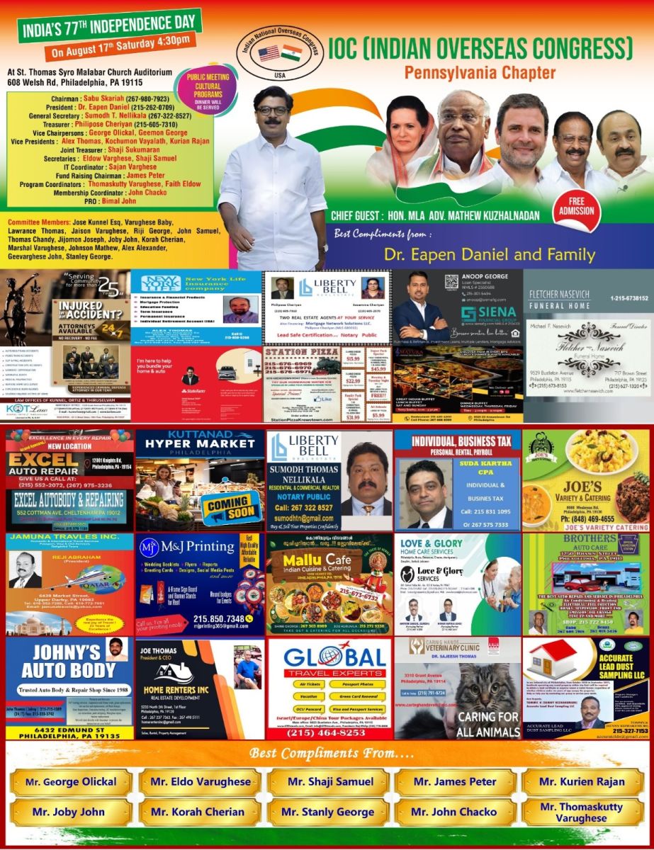 ഫിലദൽഫിയയിൽ ഇന്ത്യൻ ഓവർസീസ് കോൺഗ്രെസ് പെൻസിൽവാനിയ കേരള ചാപ്റ്ററിൻ്റെ ആഭിമുഖ്യത്തിൽ സ്വാതന്ത്ര്യ ദിനം ആഘോഷിക്കുന്നു. ആഗസ്ത് പതിനേഴാം തീയതി ശനിയാഴ്ച വൈകിട്ട് 4.30 ന് ഫിലദൽഫിയ സെന്റ് തോമസ് സീറോ മലബാർ പള്ളി ഓഡിറ്റോറിയത്തിൽ ( 608 Welsh Road , Philadelphia 19115) നടക്കുന്ന ചടങ്ങിൽ കേരള രാഷ്ട്രീയത്തിൽ അഴിമതിക്കും സ്വജനപക്ഷപാതത്തിനുമെതിരെ നിരന്തര സമരത്തിൽ ഏർപ്പെട്ടിരിക്കുന്ന ബഹു. .മൂവാറ്റുപുഴ എം എൽ എ അഡ്വ. ഡോ.മാത്യു കുഴൽനാടൻ മുഖ്യാതിഥിയായിരിക്കും. സാബു സ്കറിയ ( ചെയർമാൻ ) ,ഡോക്ടർ ഈപ്പൻ ഡാനിയേൽ ( പ്രസിഡന്റ്) സുമോദ് നെല്ലിക്കാല ( ജനറൽ സെക്രട്ടറി ) ഫിലിപ്പോസ് ചെറിയാൻ ( ട്രെഷറർ ) എന്നിവർ നേതൃത്വം നല്കുന്ന കമ്മിറ്റിയാണ് പരിപാടിക്ക് ചുക്കാൻ പിടിക്കുന്നത്. പെൻസിൽവാനിയയിലെ സാമൂഹിക സാംസ്കാരിക രംഗങ്ങളിലെ പ്രമുഖർ പരിപാടിയിൽ പങ്കെടുത്ത് ആശംസകൾ അർപ്പിക്കും . നിരവധി കലാപരിപാടികളും പരിപാടിയുടെ ഭാഗമായി അവതരിപ്പിക്കപ്പെടും . തോമസുകുട്ടി വർഗീസ് , ഫെയ്ത്ത് എൽഡോ എന്നിവർ പരിപാടിയുടെ പ്രോഗ്രാം കോർഡിനേറ്റർമാരായിരിക്കും. ഡിന്നർ ഉൾപ്പെട്ടിട്ടുള്ള ചടങ്ങിലേക്കുള്ള പ്രവേശനം സൗജന്യമായിരിക്കും. എല്ലാ ജനാധിപത്യ വിശ്വാസികളും പങ്കെടുത്തു ചടങ്ങു വിജയിപ്പിക്കണമെന്ന് സംഘാടകർ അഭ്യർത്ഥിച്ചു കൂടുതൽ വിവരങ്ങൾക്ക് : സാബു സ്കറിയ 267- 980- 7923 ,ഡോക്ടർ ഈപ്പൻ ഡാനിയേൽ 215- 262 -0709 സുമോദ് നെല്ലിക്കാല 267- 322- 8527 ഫിലിപ്പോസ് ചെറിയാൻ 215- 605- 7310