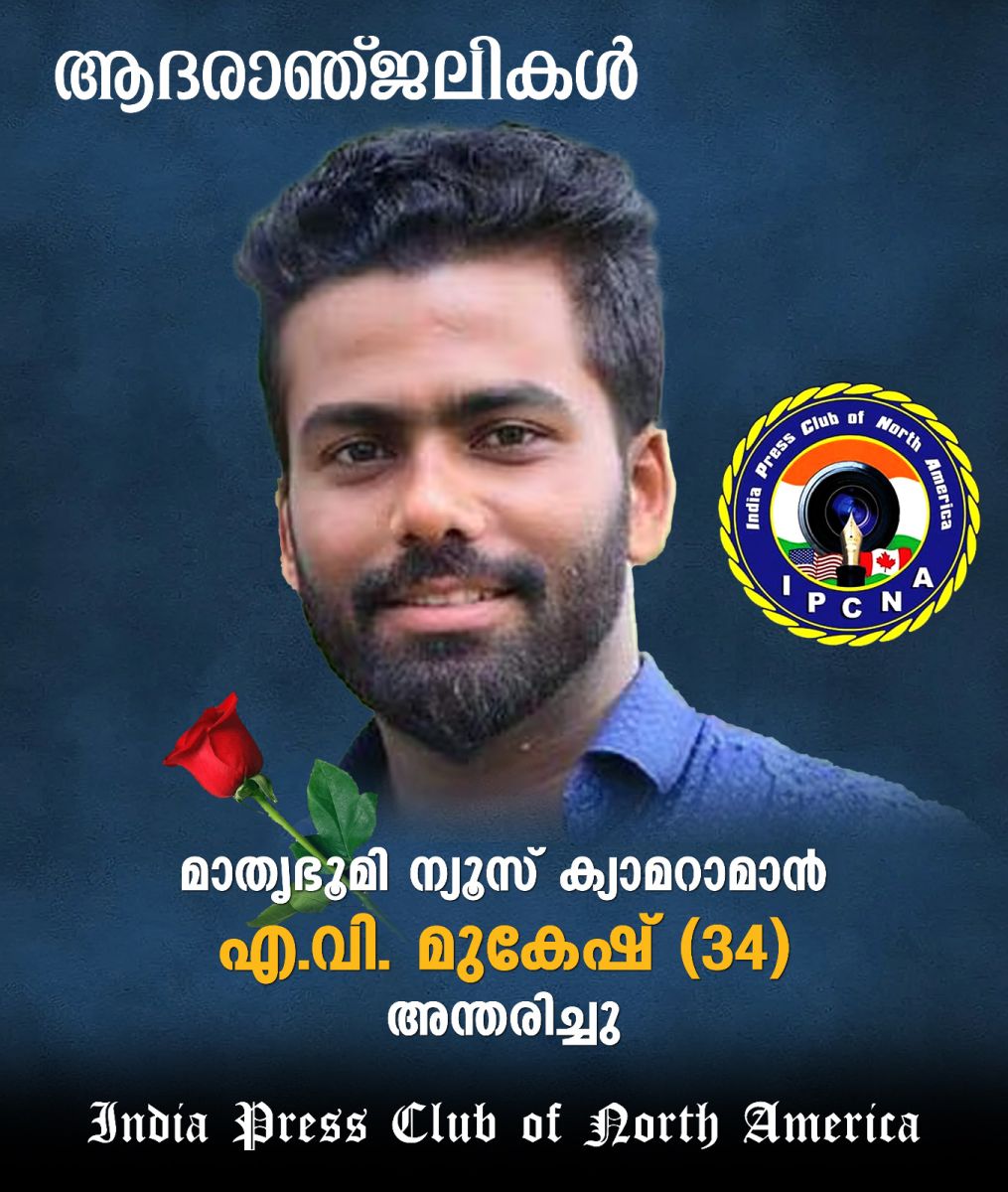 മാതൃഭൂമി ന്യൂസ് പാലക്കാട് ബ്യൂറോയിലെ ക്യാമറാമാൻ എ. വി മുകേഷ് (34) ജോലിക്കിടയിൽ കാട്ടാന ആക്രമണത്തില് മരിച്ചതിൽ ഇന്ത്യ പ്രസ് ക്ലബ് ഓഫ് നോർത്ത് അമേരിക്ക (ഐ.പി.സി.എൻ.എ) അനുശോചിച്ചു.