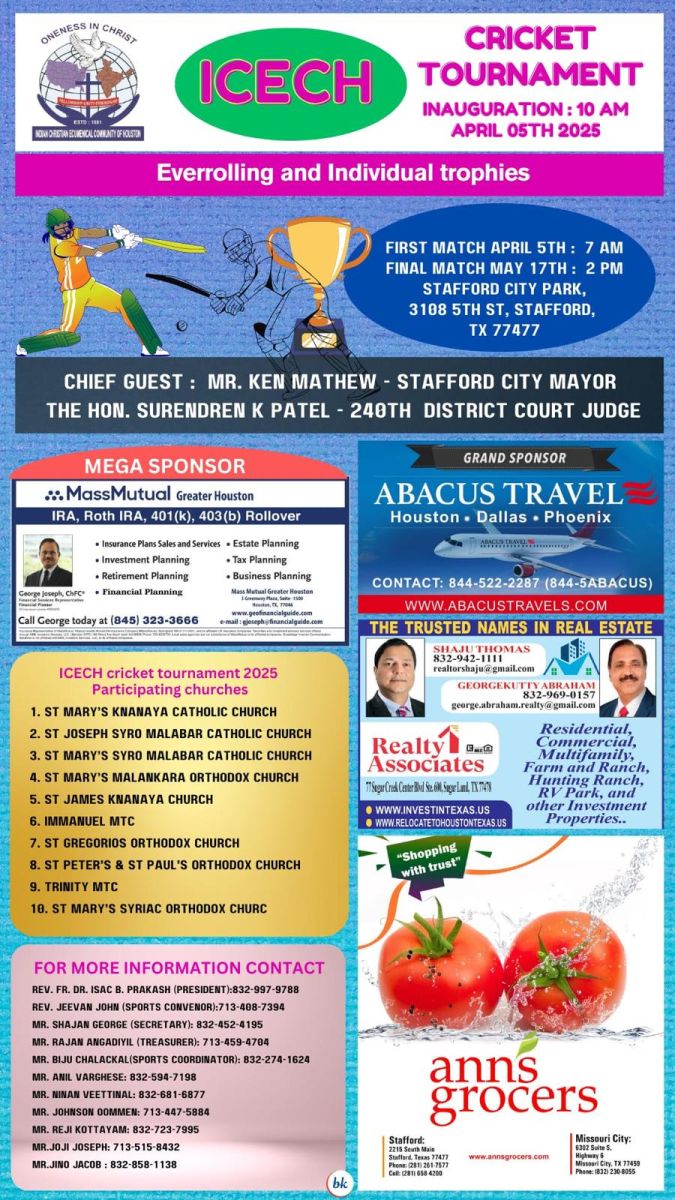 ഹൂസ്റ്റൺ: ഇന്ത്യൻ ക്രിസ്ത്യൻ എക്യൂമെനിക്കൽ കമ്മ്യൂണിറ്റി ഓഫ് ഹൂസ്റ്റന്റെ ആഭിമുഖ്യത്തിൽ "ഹൂസ്റ്റൺ ഐ സിഇസിഎച്ച് .ക്രിക്കറ്റ് ടൂർണമെന്റ് 2025" ഏപ്രിൽ 5നു ശനിയാഴ്ച രാവിലെ 10 മണിക്ക് സ്റ്റാഫോർഡ് സിറ്റി സ്റ്റേഡിയത്തിൽ വെച്ച് സ്റ്റാഫോർഡ് സിറ്റി മേയർ കെൻ മാത്യു ഉദ്ഘാടനം ചെയ്തു .