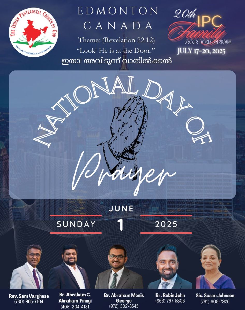 ന്യൂയോർക്ക്: ഐ.പി.സി ഫാമിലി കോൺഫ്രൻസിന്റെ അനുഗ്രഹത്തിനായി നോർത്തമേരിക്കയിലെ മുഴുവൻ ഐ.പി.സി സഭകളും ജൂൺ 1 ഞായറാഴ്ച പ്രത്യേക പ്രാർത്ഥനാ ദിനമായി വേർതിരിക്കണമെന്നും അന്നേദിവസം ലഭിക്കുന്ന സ്തോത്ര കാഴ്ചയും പ്രത്യേക സംഭാവനകളും അതത് സഭകളുടെ സംഭാവനയായി നൽകി സഹായിക്കണമെന്നും ഭാരവാഹികൾ അഭ്യർത്ഥിച്ചു.