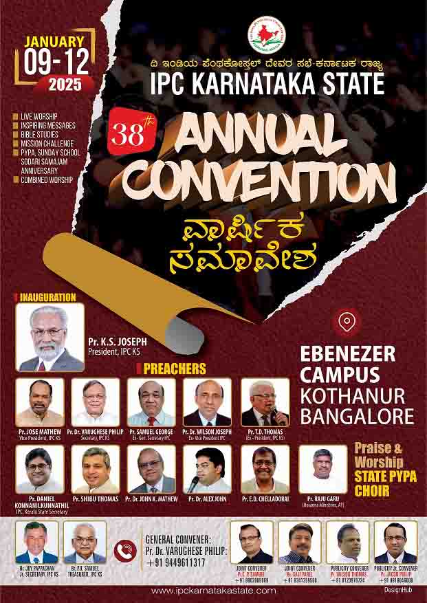 ബെംഗളൂരു: ഇന്ത്യാ പെന്തെക്കൊസ്ത് ദൈവസഭ (ഐപിസി ) കർണാടക സ്റ്റേറ്റ് 38-ാമത് വാർഷിക കൺവൻഷൻ ജനുവരി 9 വ്യാഴം മുതൽ 12 ഞായർ വരെ കൊത്തന്നൂർ എബനേസർ ക്യാംപസ് ഗ്രൗണ്ടിൽ നടക്കും. വൈകിട്ട് 6ന് സ്റ്റേറ്റ് പ്രസിഡൻറ് പാസ്റ്റർ കെ.എസ്.ജോസഫ് കൺവൻഷൻ ഉദ്ഘാടനം ചെയ്യും.