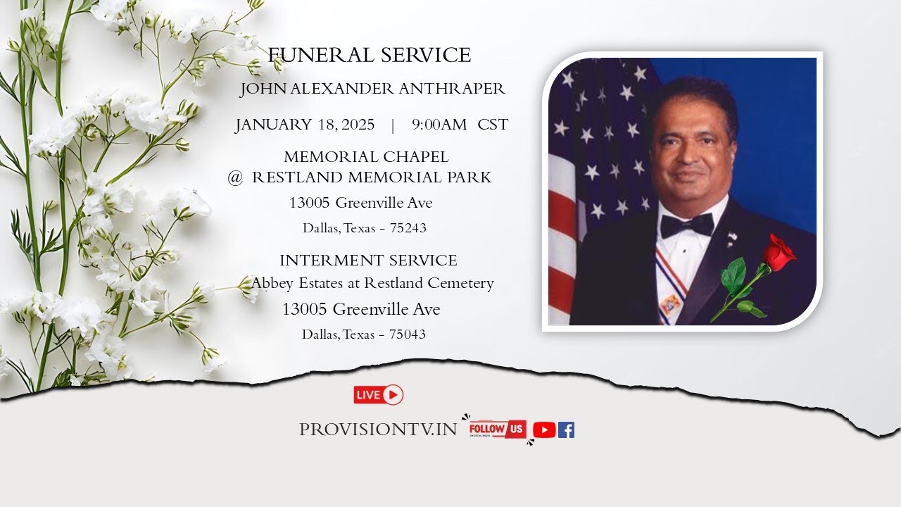 ഡാളസ് :2024 ഡിസംബർ 24 ന് ടെക്സസിലെ ഗ്രേപ്പ്വൈനിൽ അന്തരിച്ച വ്യവസായ പ്രമുഖനും ,ചാരിറ്റി പ്രവർത്തകനുമായ ജോൺ അലക്സാണ്ടർ അന്ത്രാപെറുടെ ഡിസംബർ 10 ,11 തീയതികളിൽ നിശ്ചയിച്ചിരുന്ന പൊതുദര്ശനവും , ശവസംസ്കാര ശുശ്രൂഷയും 2025 ജനുവരി 17, വെള്ളിയാഴ്ച, 18 ശനിയാഴ്ച ദിവസങ്ങളിലേക്കു മാറ്റി.