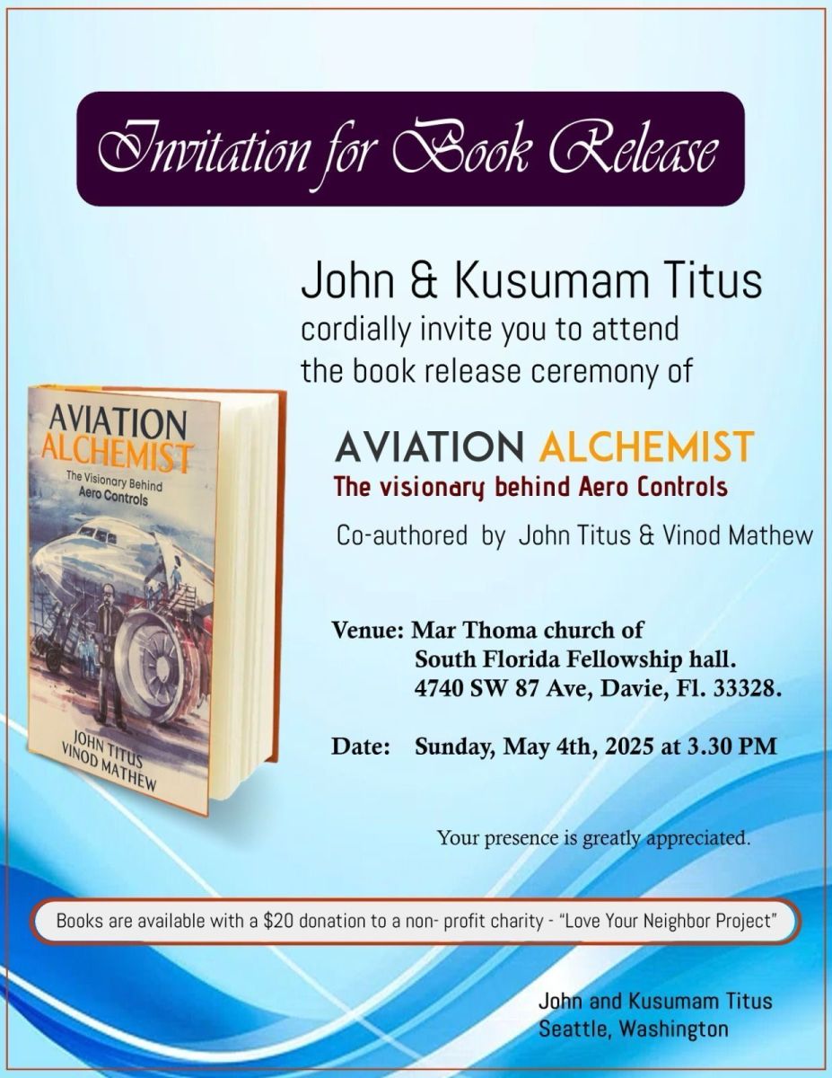 അമേരിക്കൻ മലയാളികളുടെ പ്രിയപ്പെട്ട സുഹൃത്തും ഫോമായുടെ മുന് പ്രസിഡന്റുമായ ജോൺ ടൈറ്റസിന്റെ ജീവിതകഥ പുസ്തകമാകുന്നു .'ഏവിയേഷന് ആല്ക്കെമിസ്റ്റ്' എന്ന പേരിൽ പുറത്തിറങ്ങുന്ന പസ്തകത്തിന്റെ പ്രകാശനം മെയ് 4-ാം തീയതി ഞായറാഴ്ച ഫ്ളോറിഡയില് .സൗത്ത് ഫ്ളോറിഡയിലെ മാര്ത്തോമ ചര്ച്ച് ഫെലോഷിപ്പ് ഹാളില് (4740 SW Ave, Davie, Fl. 33328) ഉച്ചകഴിഞ്ഞ് 3.30-ന് നടക്കും .ലവ് യുവർ നെയിബർ പ്രോജക്ട് ചാരിറ്റി പ്രവർത്തനങ്ങൾക്ക് 20 ഡോളർ സംഭവനായി നൽകാവുന്ന തരത്തിലാണ് പുസ്തകത്തിന്റെ വില ക്രമീകരിച്ചിരിക്കുന്നത്. ജോൺ ടൈറ്റസും മാധ്യമപ്രവർത്തകൻ വിനോദ് മാത്യുവും ചേർന്നാണ് പുസ്തകം രചിച്ചിട്ടുള്ളത്.