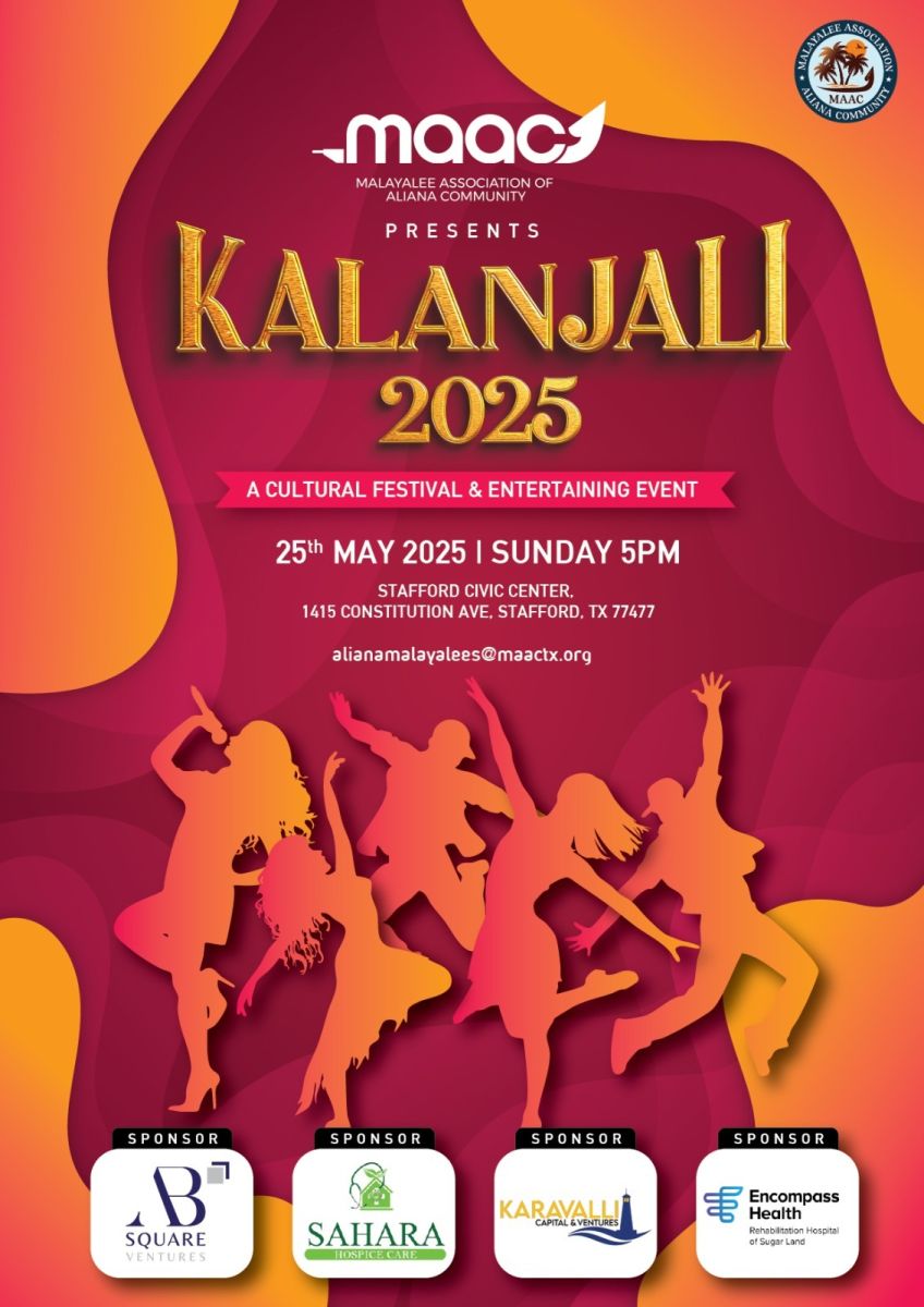 മലയാളി അസോസിയേഷൻ ഓഫ് അലിയാന കമ്മ്യൂണിറ്റി അവതരിപ്പിക്കുന്ന കലാഞ്ജലി 2025 മെയ് 25 ഞായറാഴ്ച വൈകുന്നേരം 5:00 മണിക്ക് സ്റ്റാഫോർഡ് സിവിക് സെന്ററിൽ, 1415 കോൺസ്റ്റിറ്റ്യൂഷൻ അവന്യൂ, സ്റ്റാഫോർഡ്, TX 77477-ൽ, സംസ്കാരം, നിറം, സമൂഹബോധം എന്നിവയുടെ ആകർഷകമായ ഒരു സായാഹ്നത്തിലേക്ക് മുഴുവൻ മലയാളി പ്രവാസികളെയും സുഹൃത്തുക്കളെയും മലയാളി അസോസിയേഷൻ ഓഫ് അലിയാന കമ്മ്യൂണിറ്റി സ്നേഹപൂർവ്വം ക്ഷണിക്കുന്നു. കലാഞ്ജലി 2025 കേരളത്തിന്റെ സമ്പന്നമായ കലാപരമായ പൈതൃകത്തിന്റെ ഒരു മനോഹരമായ ആഘോഷമായിരിക്കുമെന്ന് വാഗ്ദാനം ചെയ്യുന്നു, ആകർഷകമായ ക്ലാസിക്കൽ, സമകാലിക നൃത്ത പ്രകടനങ്ങൾ, ചിരിപ്പിക്കുന്ന കോമഡി സ്കിറ്റുകൾ, പാരമ്പര്യത്തെ ആധുനികതയുമായി ഇഴചേർത്ത വൈദ്യുതീകരണ ഫ്യൂഷൻ സംഗീതം എന്നിവയിലൂടെ ഇത് ജീവസുറ്റതാക്കുന്നു. പ്രകടനങ്ങൾക്ക് തിരശ്ശീല വീഴുമ്പോൾ, അതിഥികൾക്ക് വിഭവസമൃദ്ധമായ, രുചി ഭേദങ്ങളുടെ സാക്ഷാത്കാര മായ അത്താഴ വിരുന്നും കലാഞ്ജലി 2025 ന്റെ പ്രവുഡി വിളിച്ചോതുന്നതാവും . സന്തോഷവും, ഗൃഹാതുരത്വവും, സാംസ്കാരിക അഭിമാനവും നിറഞ്ഞ ഒരു മനോഹരമായ സായാഹ്നം ഒരുക്കുന്നതിനായി, സമർപ്പിതരായ വളണ്ടിയർമാരും, അഭിനിവേശമുള്ള കലാകാരന്മാരും അക്ഷീണം പ്രവർത്തിക്കുന്നു. ഇത് വെറുമൊരു ഷോയല്ല - ഹൃദയങ്ങളുടെയും പൈതൃകത്തിന്റെയും ഊർജ്ജസ്വലമായ ഒരു ഒത്തുചേരലാണ് ഇത്. ഈ അവിസ്മരണീയ സായാഹ്നത്തിന്റെ ഭാഗമാകാൻ മുഴുവൻ മലയാളി സമൂഹത്തെയും, അഭ്യുദയകാംക്ഷികളെയും ഞങ്ങൾ സ്നേഹപൂർവ്വം സ്വാഗതം ചെയ്യുന്നു. നമ്മുടെ വേരുകൾ ആഘോഷിക്കാനും, പ്രിയപ്പെട്ട ഓർമ്മകൾ സൃഷ്ടിക്കാനും നമുക്ക് ഒത്തുചേരാം. 🎟 ഇന്ന് തന്നെ നിങ്ങളുടെ സീറ്റുകൾ ഇവിടെ ബുക്ക് ചെയ്യുക: https://www.maactx.org/kalanjaliregistration