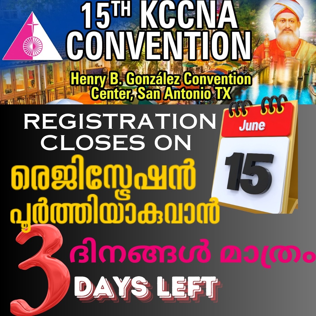 2024 ജൂലൈ 4 മുതൽ 7 വരെ ടെക്സാസ് സാൻ അൻ്റോണിയോയിലെ , Henry B. Gonzalez Convention Center-ൽ നടക്കുന്ന 15-ാമത് KCCNA കൺവെൻൻറെ രെജിസ്ട്രേഷൻ ജൂൺ 15 -നു അവസാനിക്കുന്നു. വടക്കേ അമേരിക്കയിലെ ക്നാനായ മക്കൾ വളരെ ആവേശത്തോടെ നൽകിയ ശക്തമായ പിന്തുണക്ക് KCCNA കൺവെൻഷൻ കമ്മിറ്റി എല്ലാവരോടും നന്ദി അറിയിക്കുന്നതായി എക്സിക്യൂട്ടീവ് കമ്മറ്റിക്ക് വേണ്ടി പ്രസിഡന്റ് ഷാജി ഏടാട്ടും കൺവെൻഷൻ ചെയർമാൻ ജെറിൻ കുര്യൻ പടപ്പൻമാക്കിലും അറിയിച്ചു . ആകെ രെജിസ്ട്രേഷനുകൾ 1000-ന് അടുത്തെത്തി നിൽക്കുന്നു.
