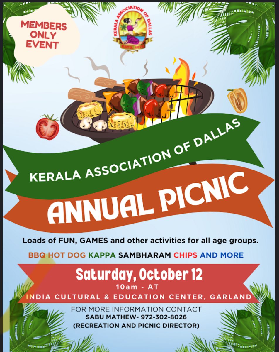 ഗാർലാൻഡ് (ഡാളസ്): കേരള അസോസിയേഷൻ ഓഫ് ഡാളസ് വാർഷിക പിക്നിക് ഒക്ടോബർ 12, ശനിയാഴ്ച രാവിലെ 10:00 മുതൽ ഇന്ത്യ കൾച്ചറൽ ആൻഡ് എജ്യുക്കേഷൻ സെൻ്റർ, 3821 Broadway Blvd, Garland, TX 75043 വെച്ച് നടത്തപ്പെടുന്നു
