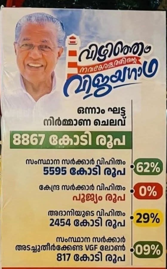 ഉമ്മൻചാണ്ടി വിഴിഞ്ഞം പോർട്ടിനു വേണ്ടി ആകെ ഒരു കല്ല് മാത്രമേ ഇട്ടിട്ടുള്ളൂ. പക്ഷേ അത് മലയാളിയുടെ തലയിൽ ആണെന്ന് മാത്രം. തിരി കത്തിച്ചാൽ ആരും വിശുദ്ധനാകില്ല . കുളിമുറി തുറന്നിട്ട് കുളിക്കാൻ ആത്മവിശ്വാസമുണ്ടെന്ന് വെറുതെ തള്ളുന്ന അഴിമതിയുടെ കറ പുരണ്ട -തുടരും -സിനിമയിലെ ജോർജ്ജ് സാറാണ് യുഡിഫ് നേതാക്കൾ . അത് പറഞ്ഞു തന്നെ പോകണം.ആരെങ്കിലും വിഴിഞ്ഞം പദ്ധതിയുടെ ക്രെഡിറ്റ് ഉമ്മെഞ്ചാണ്ടി സാറിന് കൊടുക്കാൻ പറഞ്ഞാൽ ഒറ്റ ഉത്തരമേ ഉള്ളു കല്ലിട്ടാൽ കപ്പലോടില്ല ..കല്ലിടൽ ഗ്രൂപ്പിൽ നിന്ന് എൽഡിഫ് രീതി എന്നാൽ കാര്യാ ശേഷി വർദ്ധിപ്പിയ്ക്കുകയെന്ന പേരിൽ പുതിയ സ്പ്ലെമെന്റൽ കരാറുണ്ടാക്കി കാലാവധി 2045 പൂർത്തിയാകേണ്ടത് 2028 അവസാനിക്കും അതോടെ കേരളത്തിന് മികച്ച സാമ്പത്തിക വാണിജ്യ പുരോഗതി ഉണ്ടാകുമെന്നാണ് വിലയിരുത്തുന്നത് വിഴിഞ്ഞം ഇന്ന് കമ്മീഷൻചെയ്യുന്നതോടെ ചുരുങ്ങിയത് 10000 കോടിയുടെ നിക്ഷേപം ഉണ്ടാകും ഭാവിയിൽ ഒരു ദുബായിയോ സിംഗപൂരോ ആയി കേരളം മാറും ...വീണ്ടും ഓർക്കുക "കല്ലിട്ടാൽ കപ്പലോടില്ല" ..